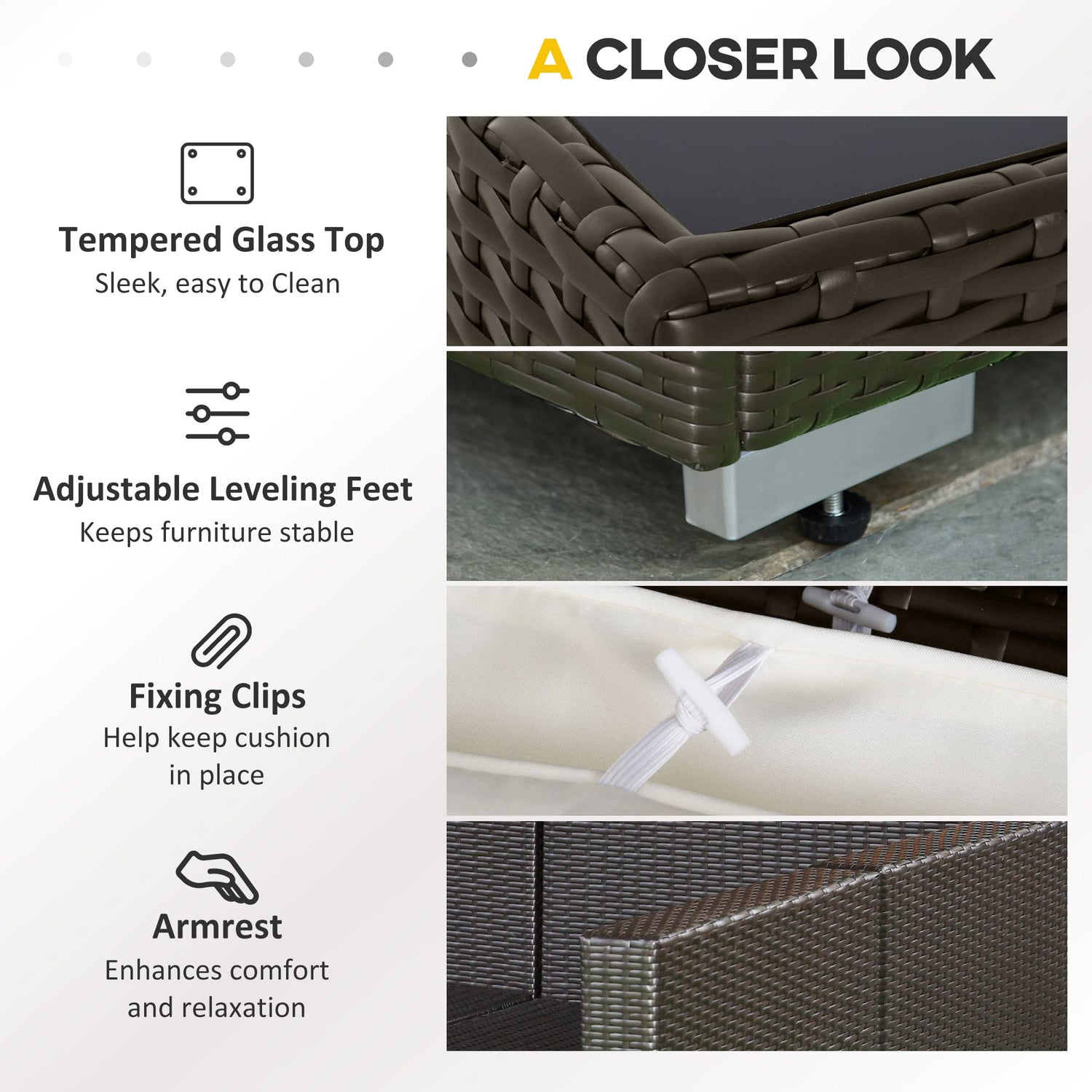 - Outdoor Coffee Table: Enjoy dinner, drinks, or play a board game. Our sectional patio furniture set includes a "wipe-clean" tempered glass coffee table; so, there will be no crying over spilled milk.