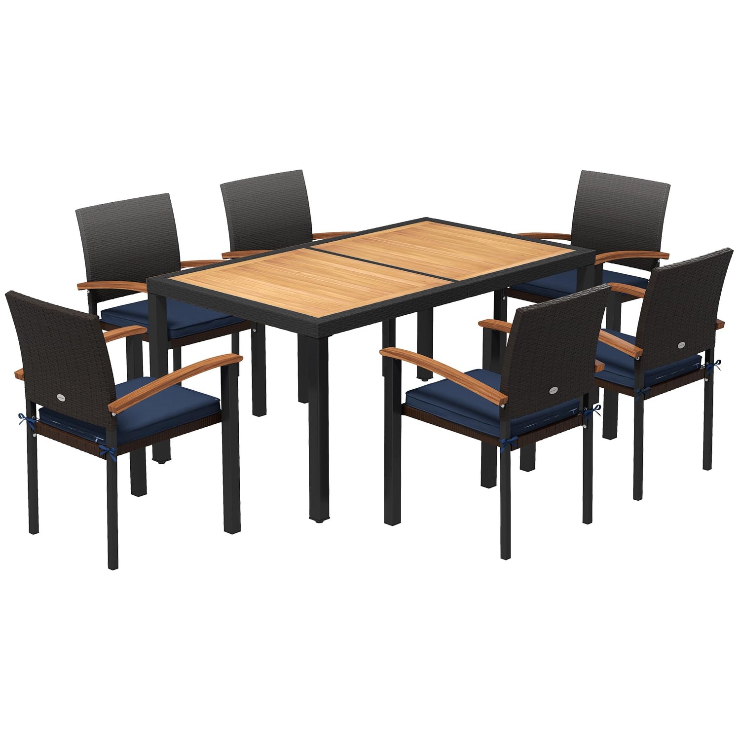 Transform your backyard into a cozy haven with the Outsunny 7-piece patio dining furniture, featuring a sleek patio table and six armchairs that tuck away neatly for a clutter-free ambiance. Indulge in comfort with seat cushions, easily maintained thanks to removable covers. This outdoor dining set pairs a charming wooden tabletop with a resilient steel and wicker construction for endless alfresco memories.