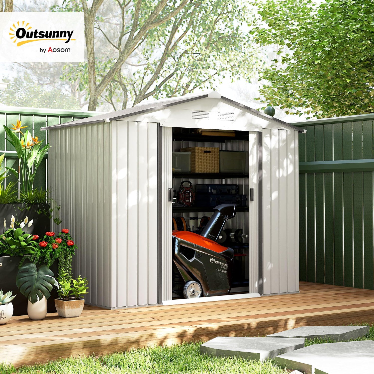 Outsunny 7' x 4' Outdoor Storage Shed, Garden Tool Metal Shed with Foundation Kit, Double Lockable Door, Air Vents and Sloping Roof, for Backyard, Patio, Lawn, White