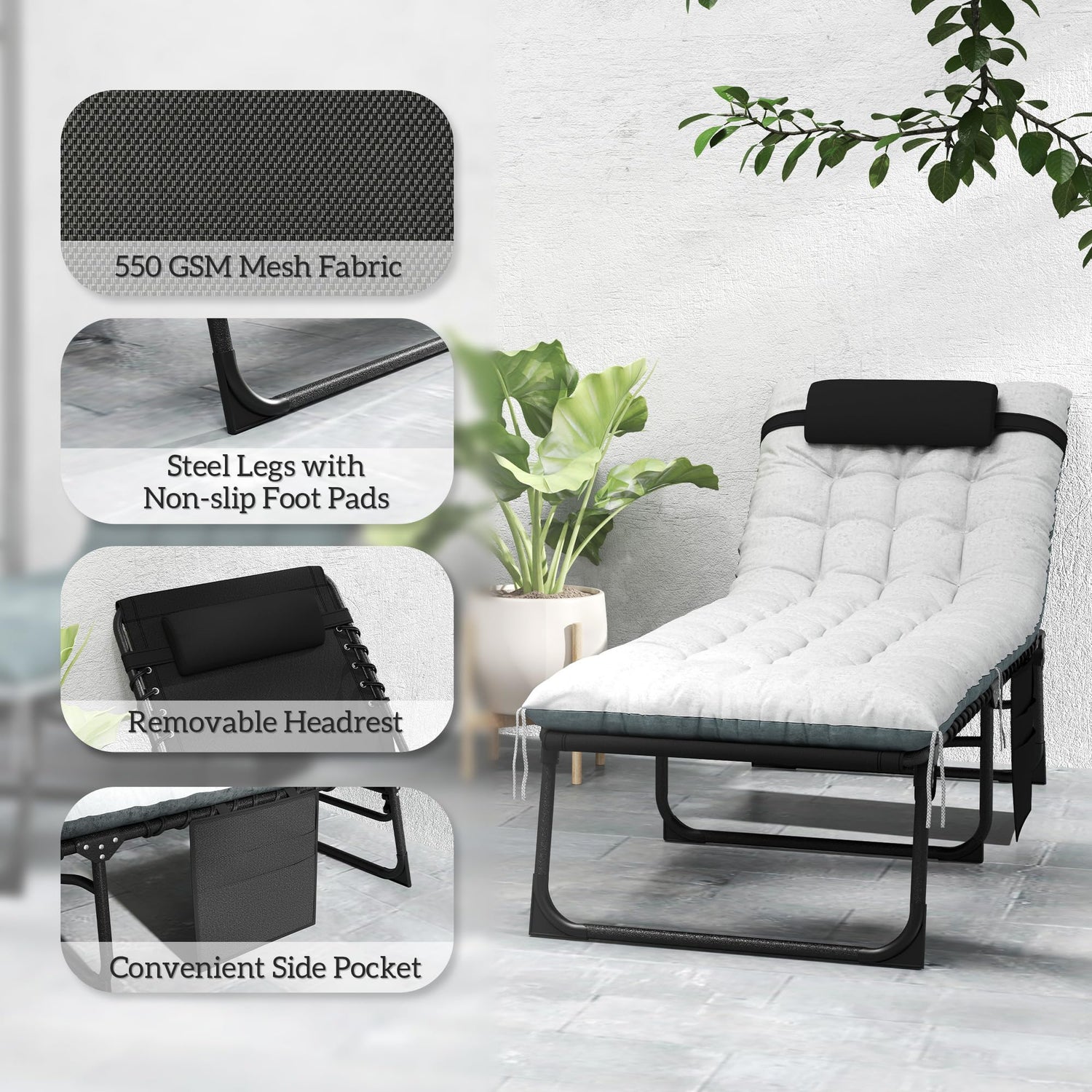 Outsunny Chaise Lounge Chair Outdoor Set of 2, 5-Position Adjustable Outdoor Pool Lounge Chairs, Folding Tanning Chair Beach Lounger with Cushion, Headrest, Side Pocket for Patio, Yard, Black/Gray