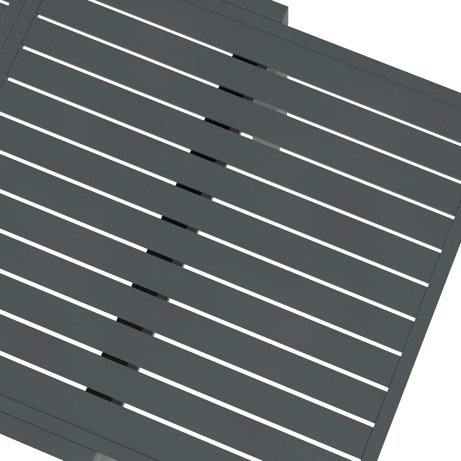 - Stylish Slatted Design: A slatted surface makes our expandable outdoor dining table easy to wipe dry after rain. A slatted build offers a familiar rustic look, similar to a picnic table, while still keeping the upsides of aluminum.