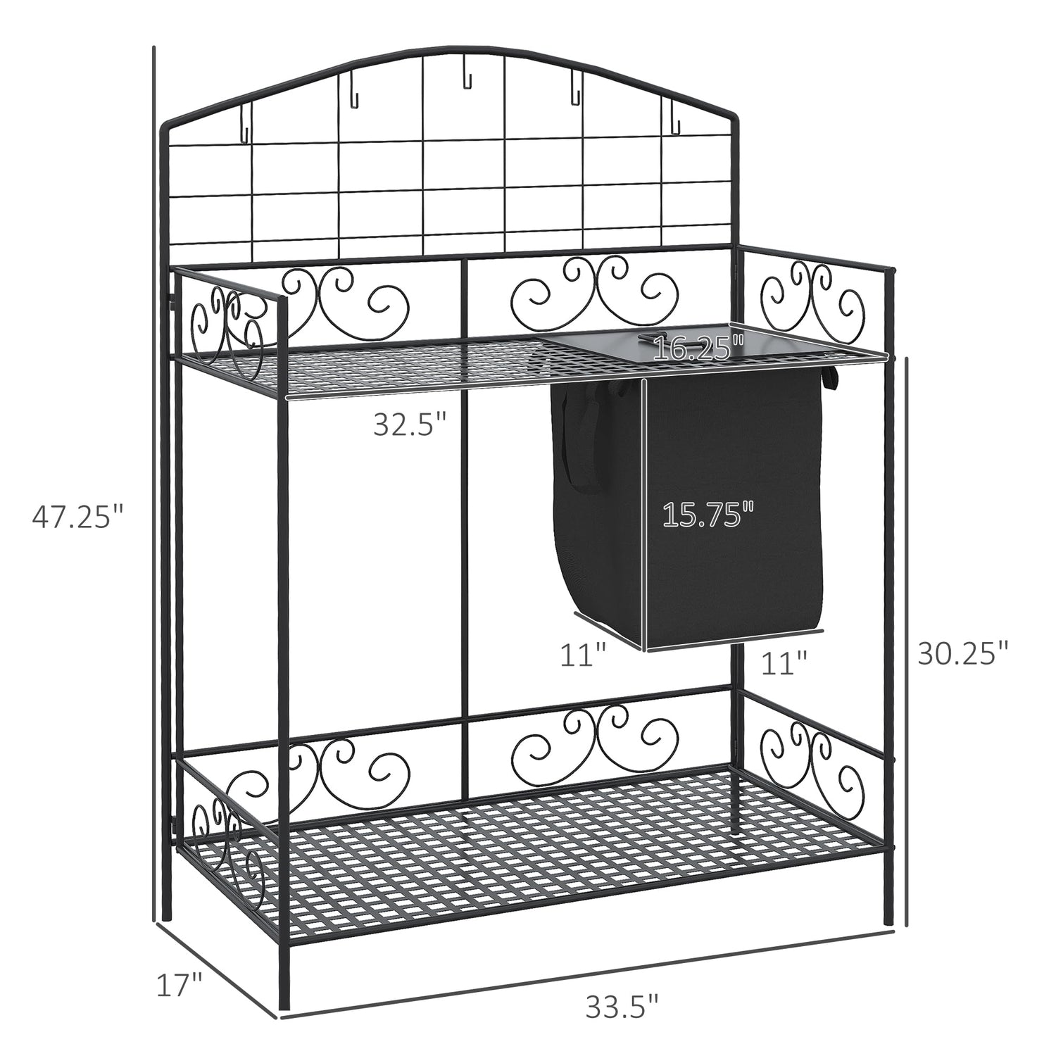 - Flourish Motif Steel Potting Table Info: Overall Dimensions: Max Load: 66 lbs. (Tabletop), 44 lbs. (Bottom Shelf), 4 lbs. (Hook), 4 lbs. (Bag). Overall Dimensions: 33.5" L x 17" W x 47.25" H. Tabletop Dimensions: 32.5" W x 16.25" D. Tabletop Height: 30.25" H. Bottom Shelf Height: 4" H. Bag Dimensions: 11" L x 11" W x 15.75" H. Assembly required.