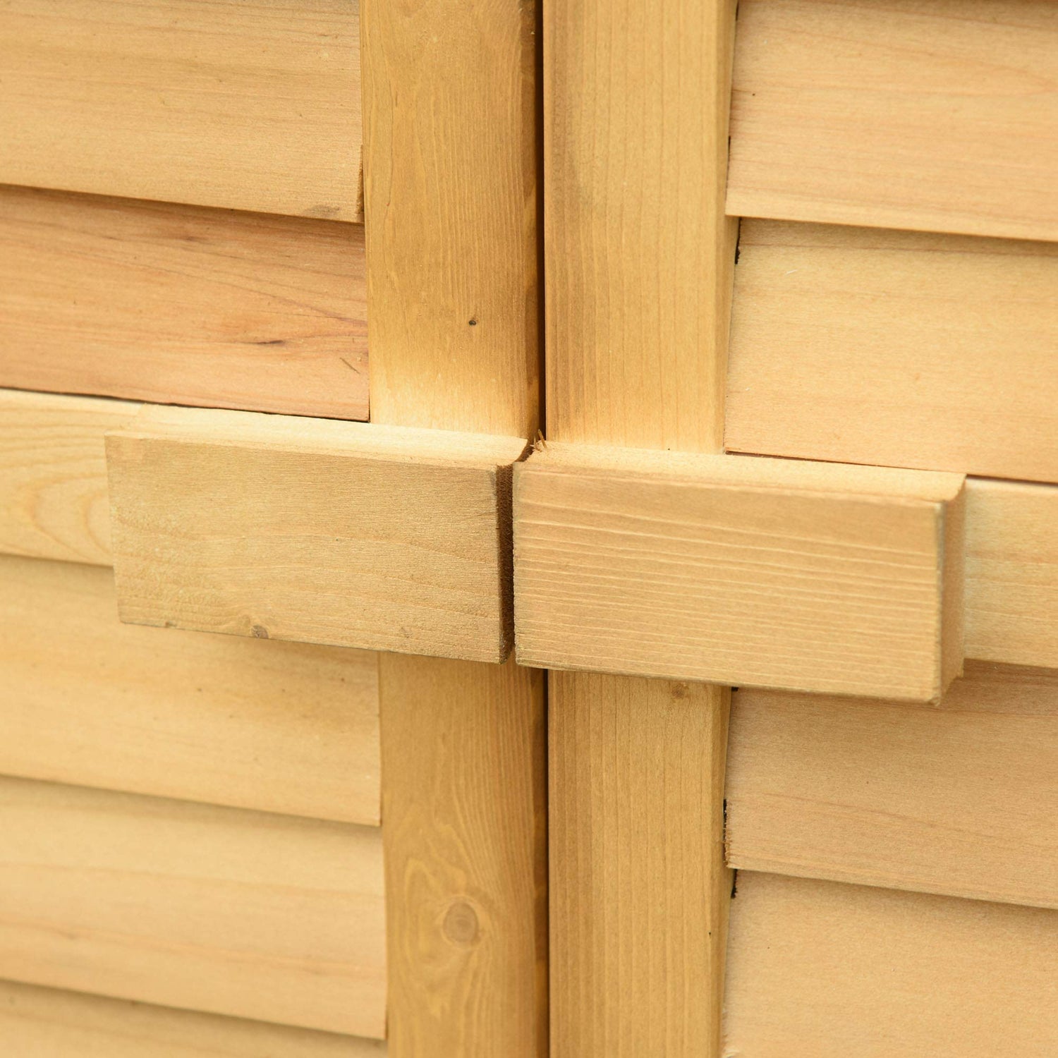 - Solid Fir Wood: The well-organized shelves and thick solid fir wood construction of this vertical storage shed is covered with a weather coating that helps to provide a long service lifespan.