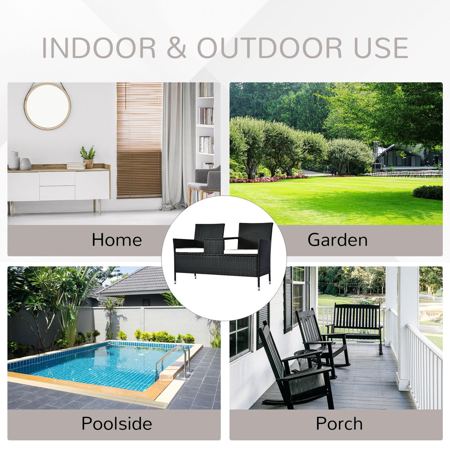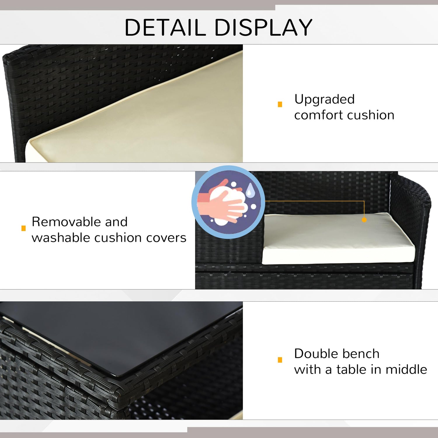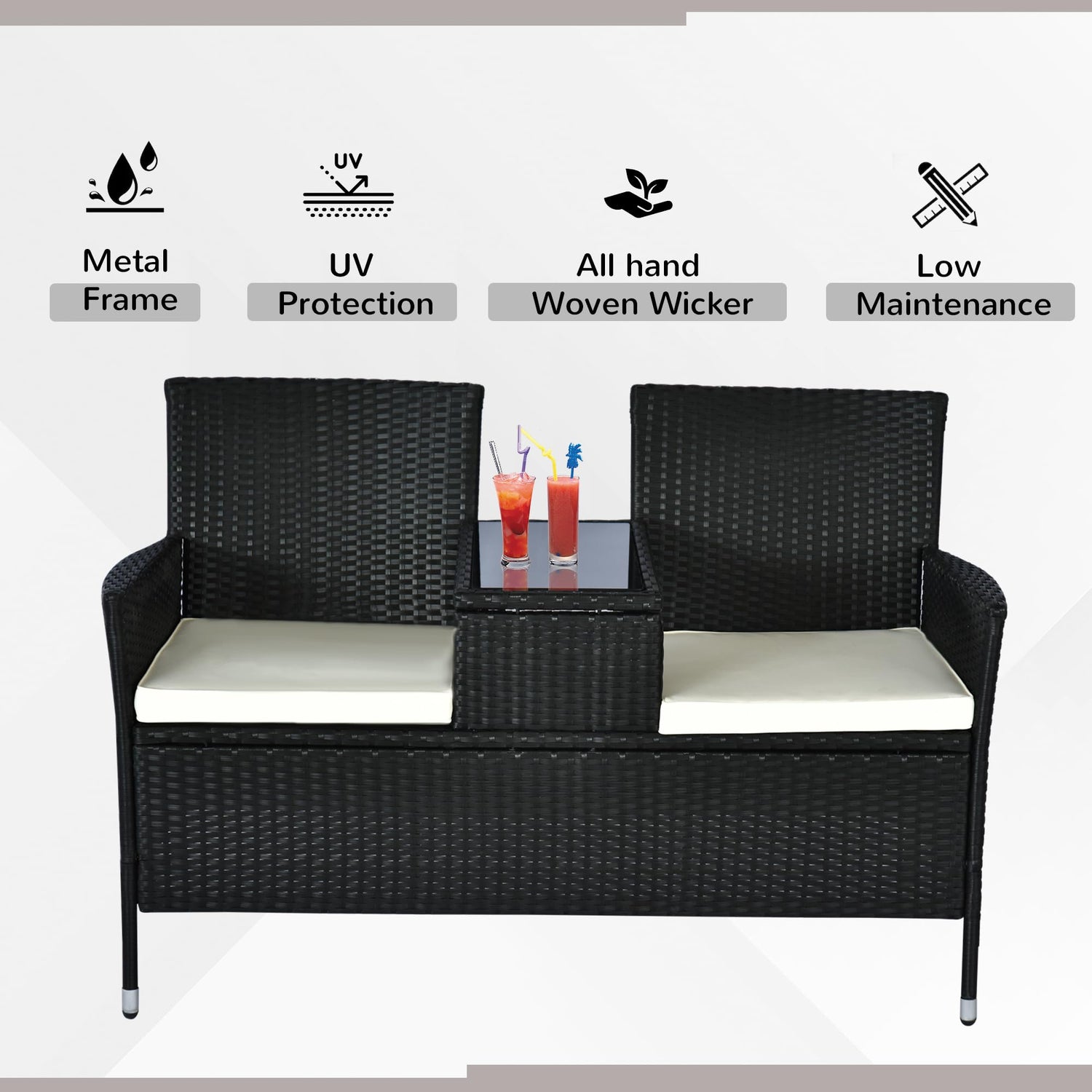 Details: Get the most out of the warm weather with Outsunny. Our double rattan wicker chair set brings together two chairs and small tea table into one convenient unit. It's a perfect way to enjoy conversations with a beverages and snacks. With durable steel frames, UV resistant rattan weave and washable seat covers makes this a practical choice while enjoying your outdoor space.