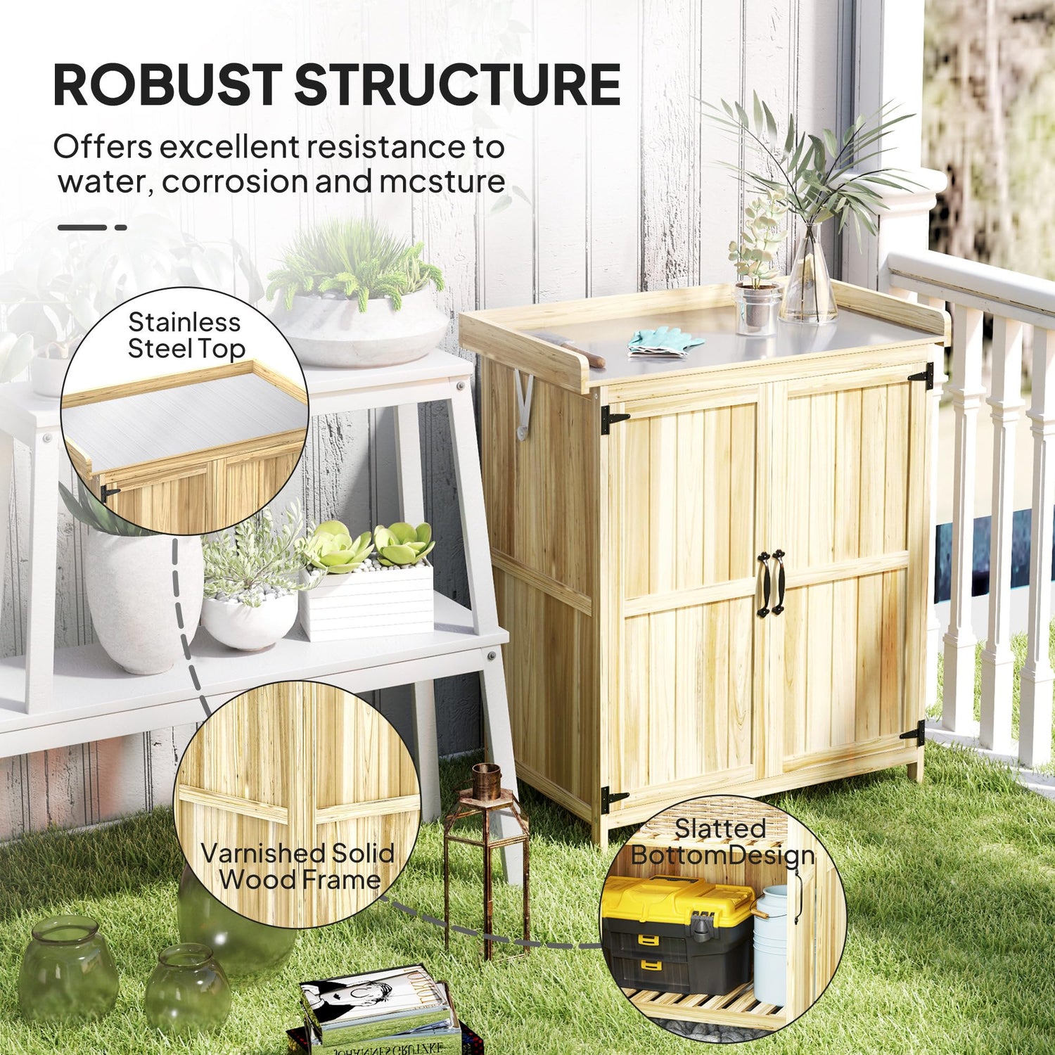 Outsunny Outdoor Storage Cabinet, Garden Tool Shed with Metal Tabletop and Shelf, Wooden Potting Bench with 2 Doors for Backyard, Patio, Lawn, Natural Wood