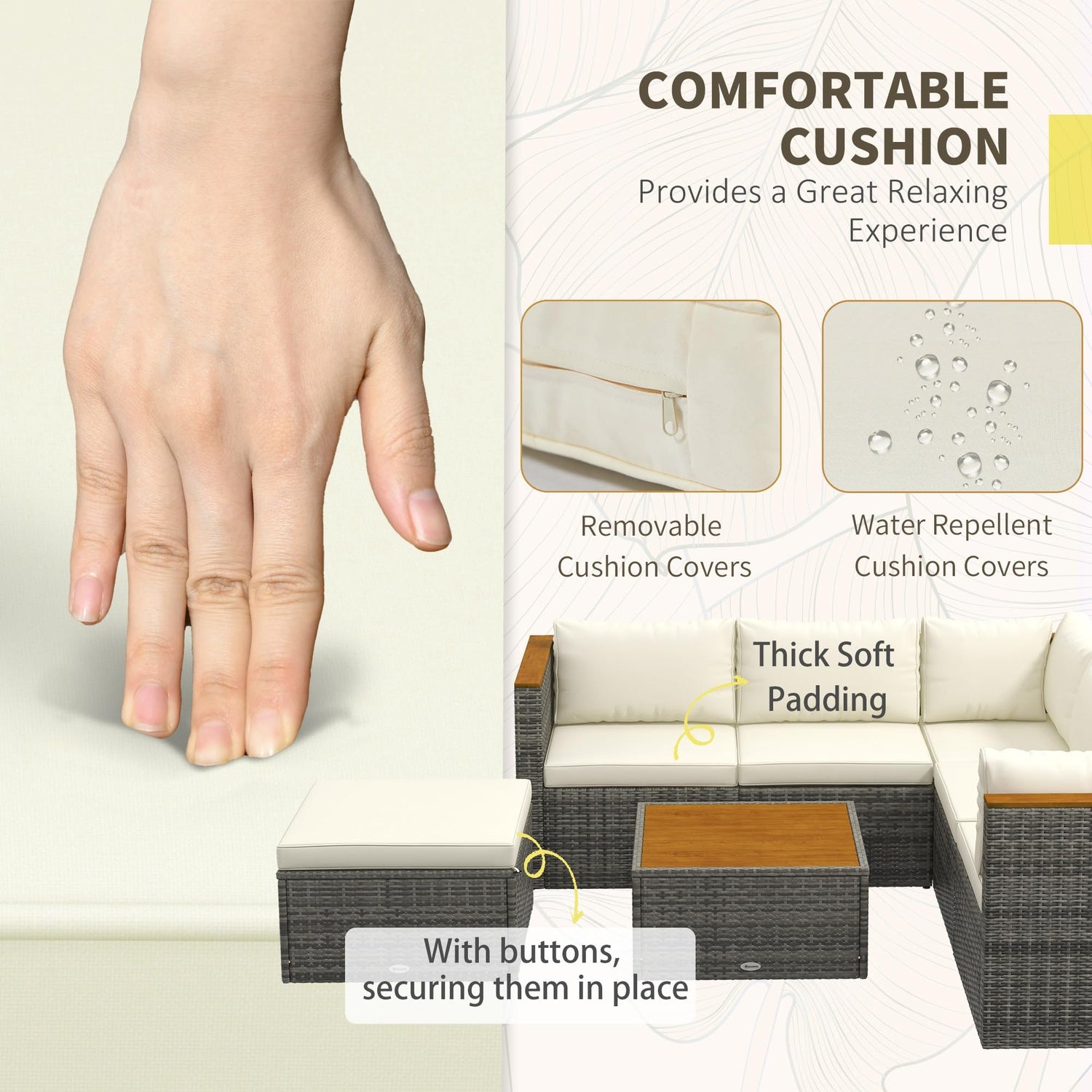 - Cozy and Clean: Enjoy the plush comfort of soft cushions and pillows, complete with button fastening on this patio furniture set, making them easy to maintain and keep tidy.