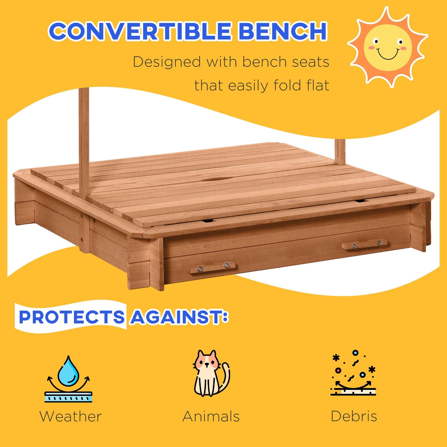 Outsunny Wooden Kids Sandbox with Cover, Children Outdoor Sand Box with Foldable Bench Seats, Adjustable Canopy, Bottom Liner for Outdoor, Red