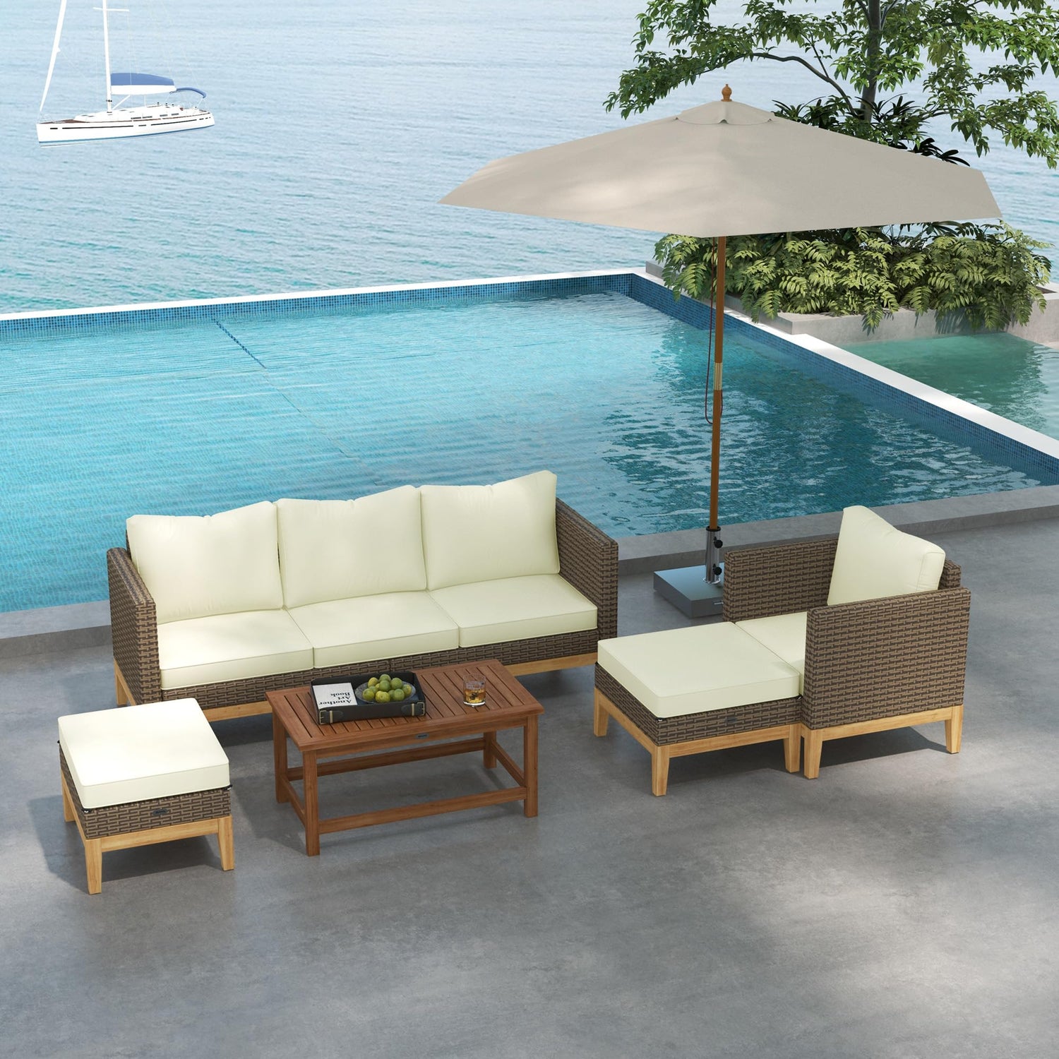 Outsunny Wooden Patio Furniture Set with Thick Padded Cushions, 5-Piece PE Rattan Sectional Sofa with Acacia Wood Top Coffee Table, Outdoor Conversation Set, Cream White