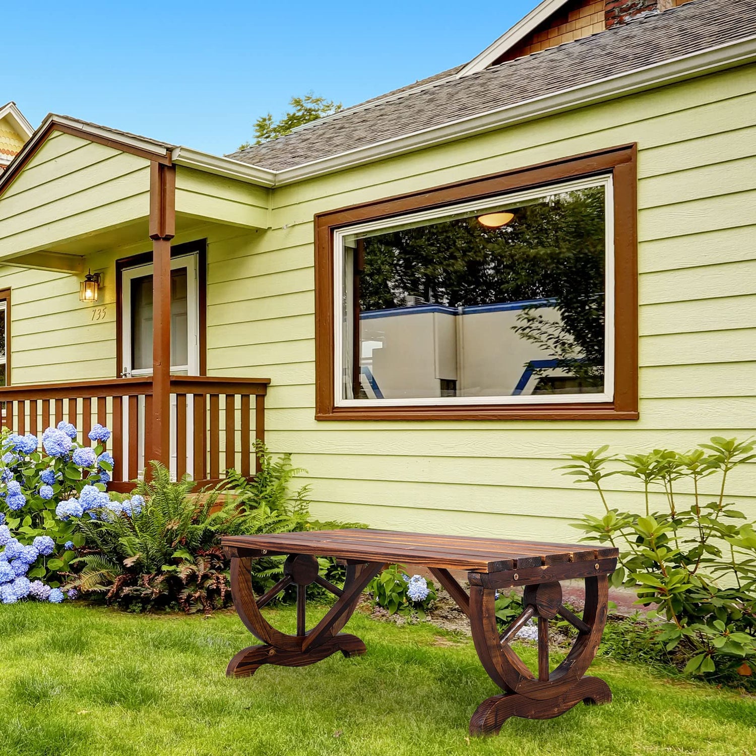 Outvita Rustic Wagon Wheel Wooden Garden Bench for Outdoor Seating, Carbonized Finish – Seats 2 in Brown