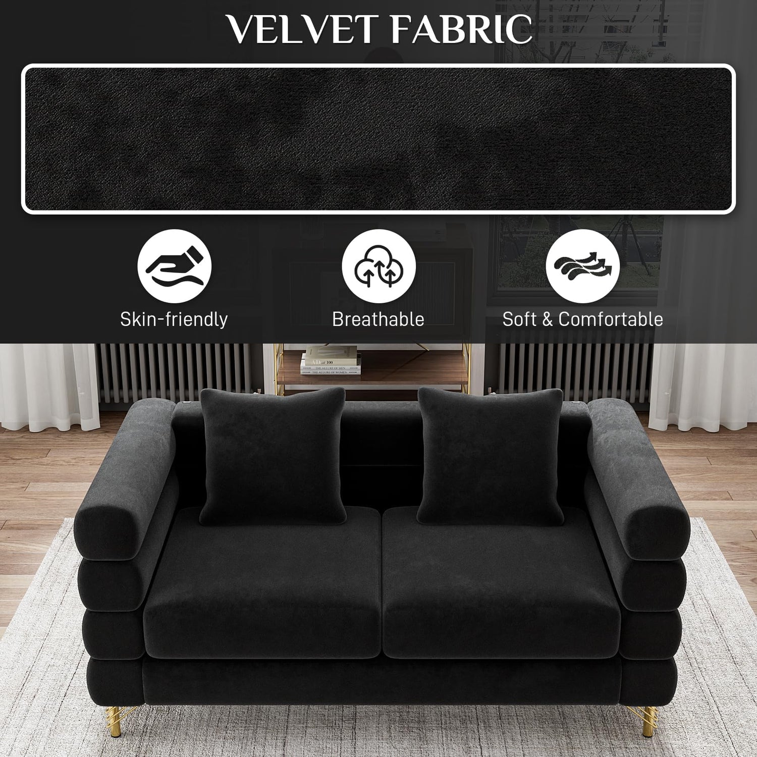 - 【Sturdy Frame Structure】Heavy duty solid wood frame and sturdy electroplating steel legs feature 600LB maximum weight capacity ensure your safety when sleeping, rolling or jumping on the large sofa. Overall curved design, full shape, and hand-pulled points, The modern velvet fabric couch matches perfectly with any decorative theme, you can place the sofa in the living room, office, bedroom.