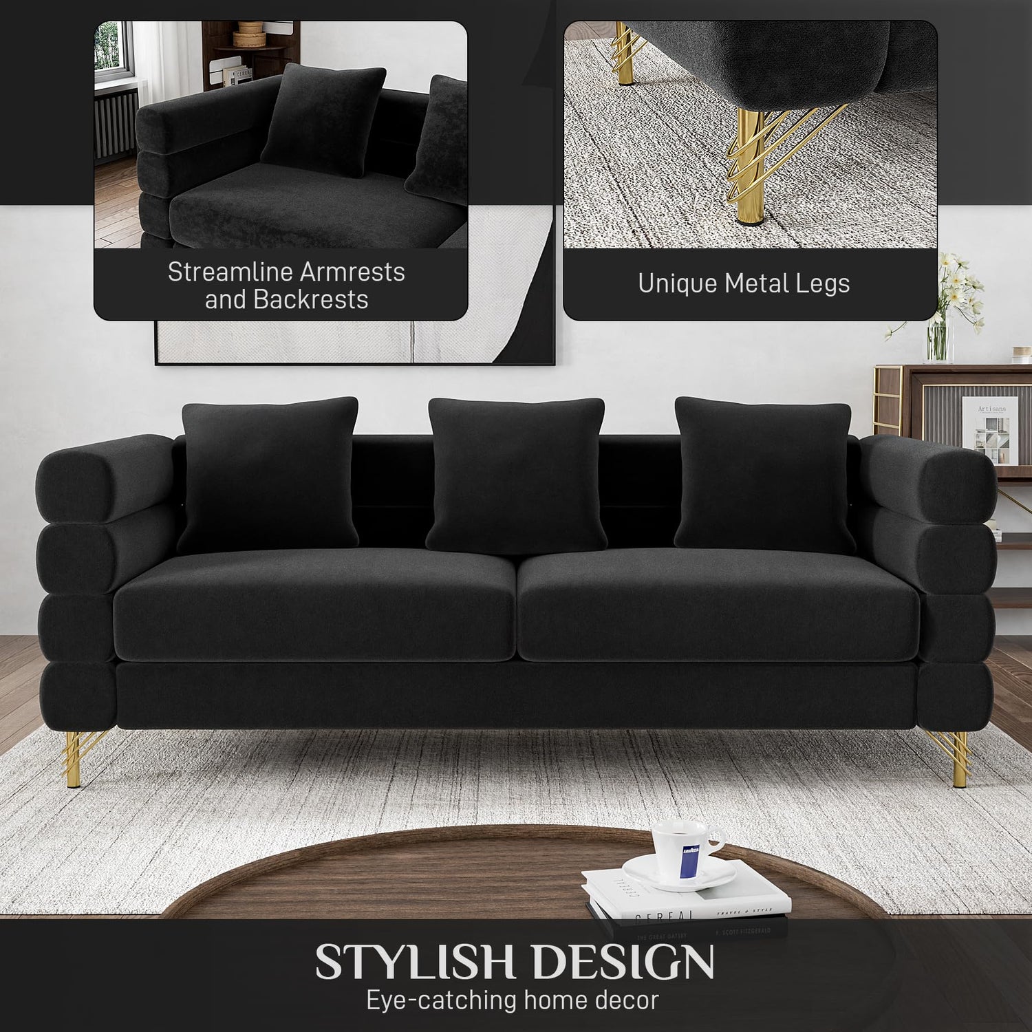 - Black Velvet Couch with Premium Material: Experience ultimate comfort with the velvet sofa, crafted from high-quality velvet fabric. This luxurious material offers a soft, silky touch and a unique glossy feel, making black velvet sofa both delicate and skin-friendly. Upholstered with plush channel tufts all around, this teddy sofa promises a cozy, pillow-like feel and creates a strong ornamental presence in your living space.