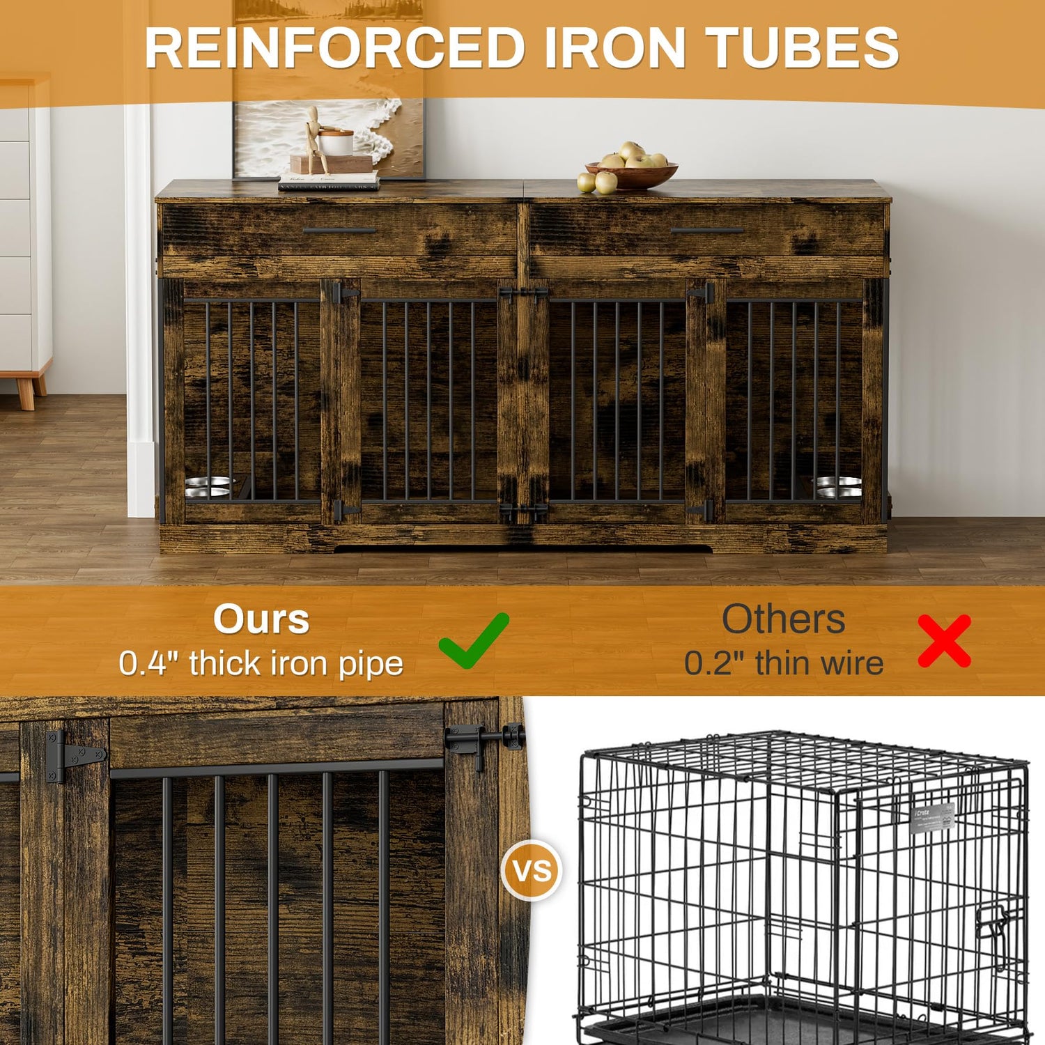- 【Reliable and Secure Design】The indoor dog kennel is equipped with high quality abrasion resistant iron railings. Therefore, you and your dogs can see each other through the railings, which makes a nervous puppy feel safe and relaxed. It also convenient for you to observe the condition of your pets at any time. Elevated feet help to keep the crate dry and prevent dampness.