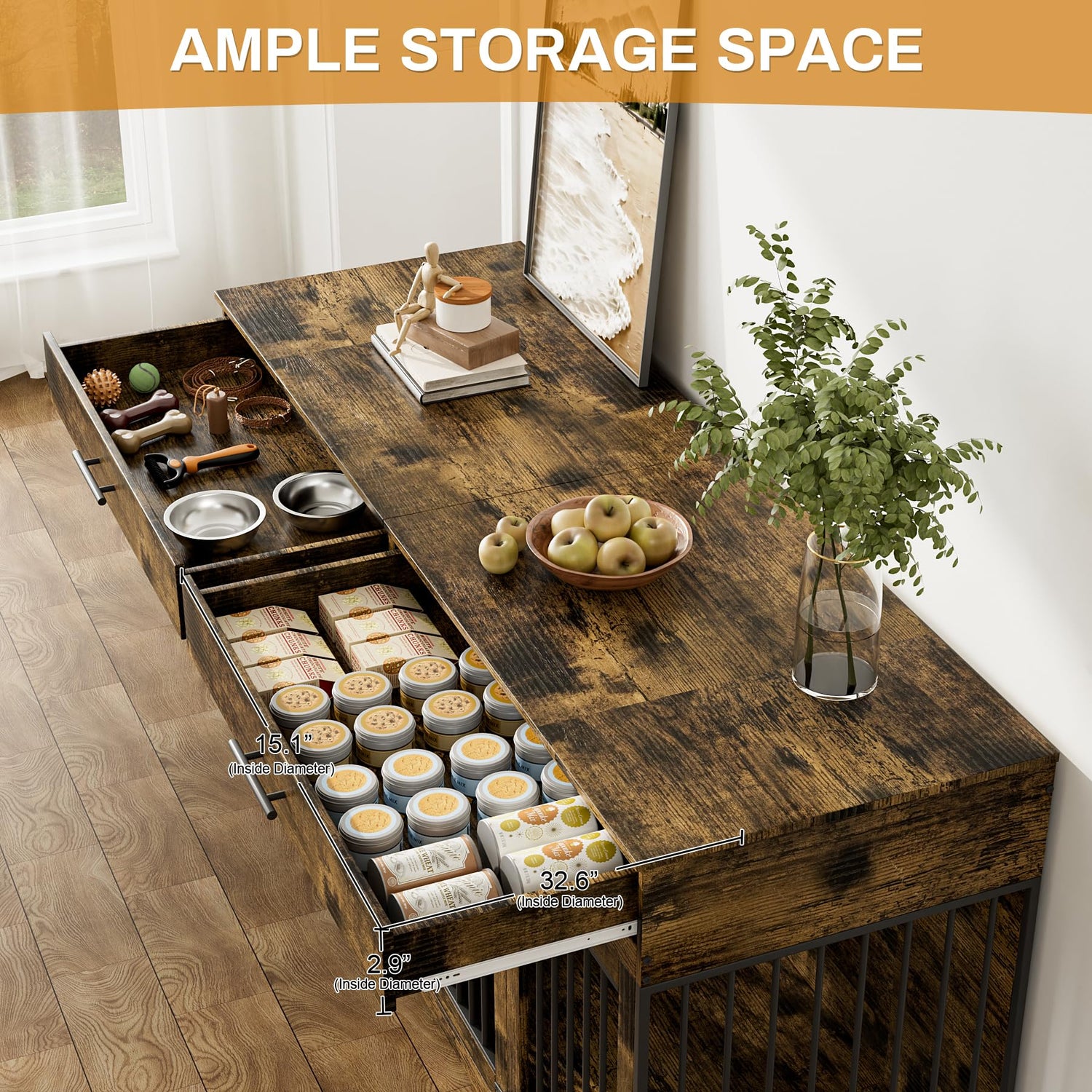- 【Dog Cage with 2 Storage Drawers】The upper part of the decorative wood dog crate has 2 large drawers, you can store dog food, snacks, leashes, etc. And this kennel also has the wide desktop that you can display decorations such as plants, magazines, picture frames, night light and so on.