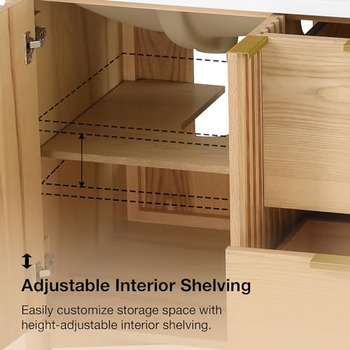 - Two soft-closing doors with a single adjustable interior shelf, plus two double-deep drawers to store supplies out of sight