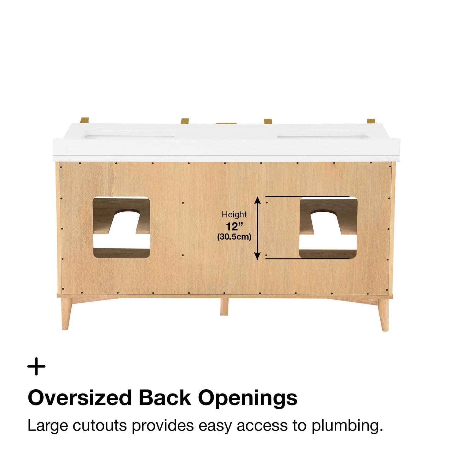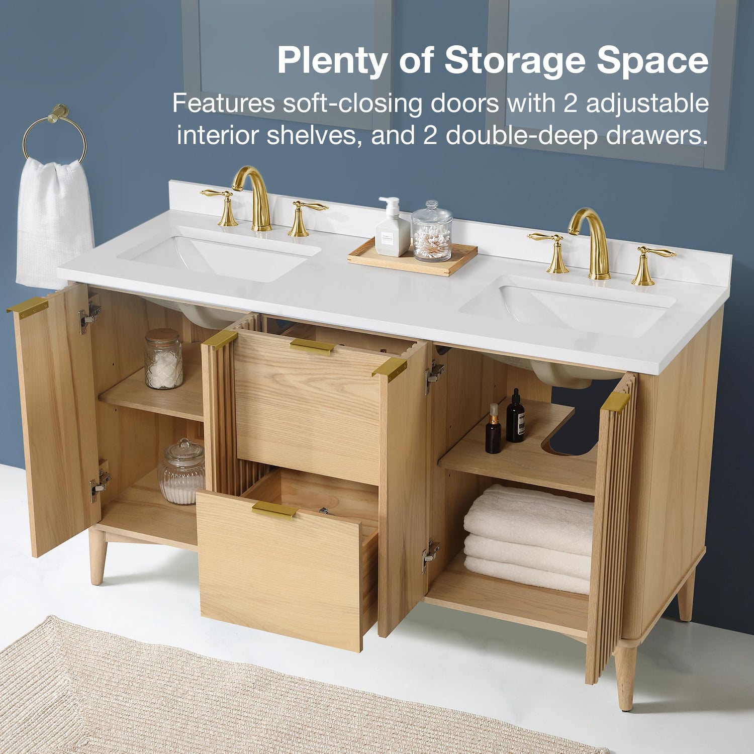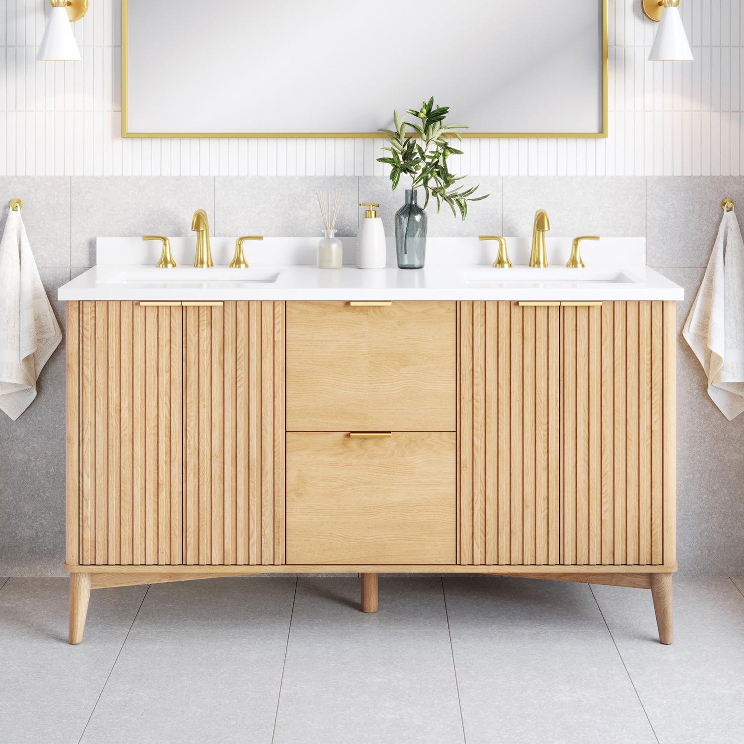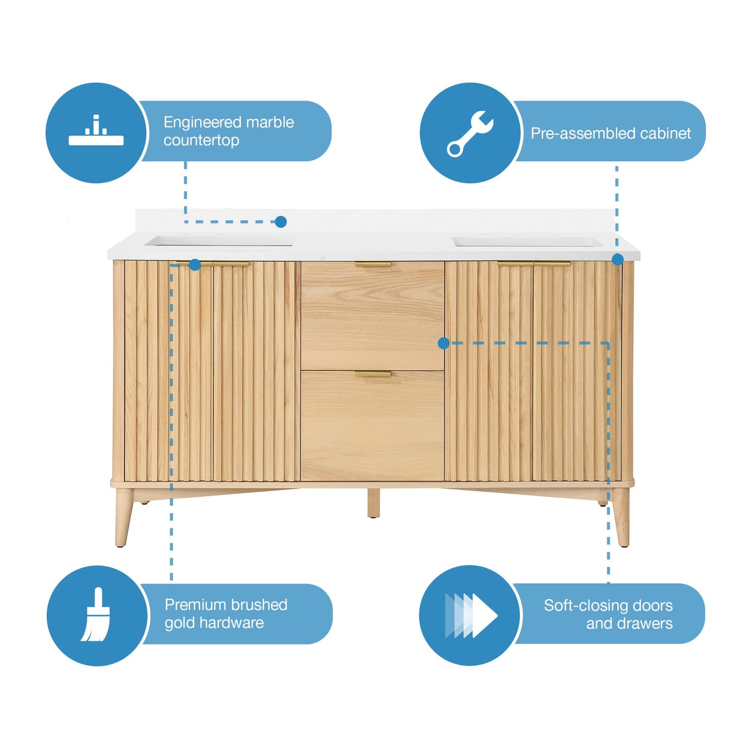 - Indy 60-in Rustic Ash Undermount Double Sink Bathroom Vanity with White Engineered Marble countertop for a Scandinavian look
