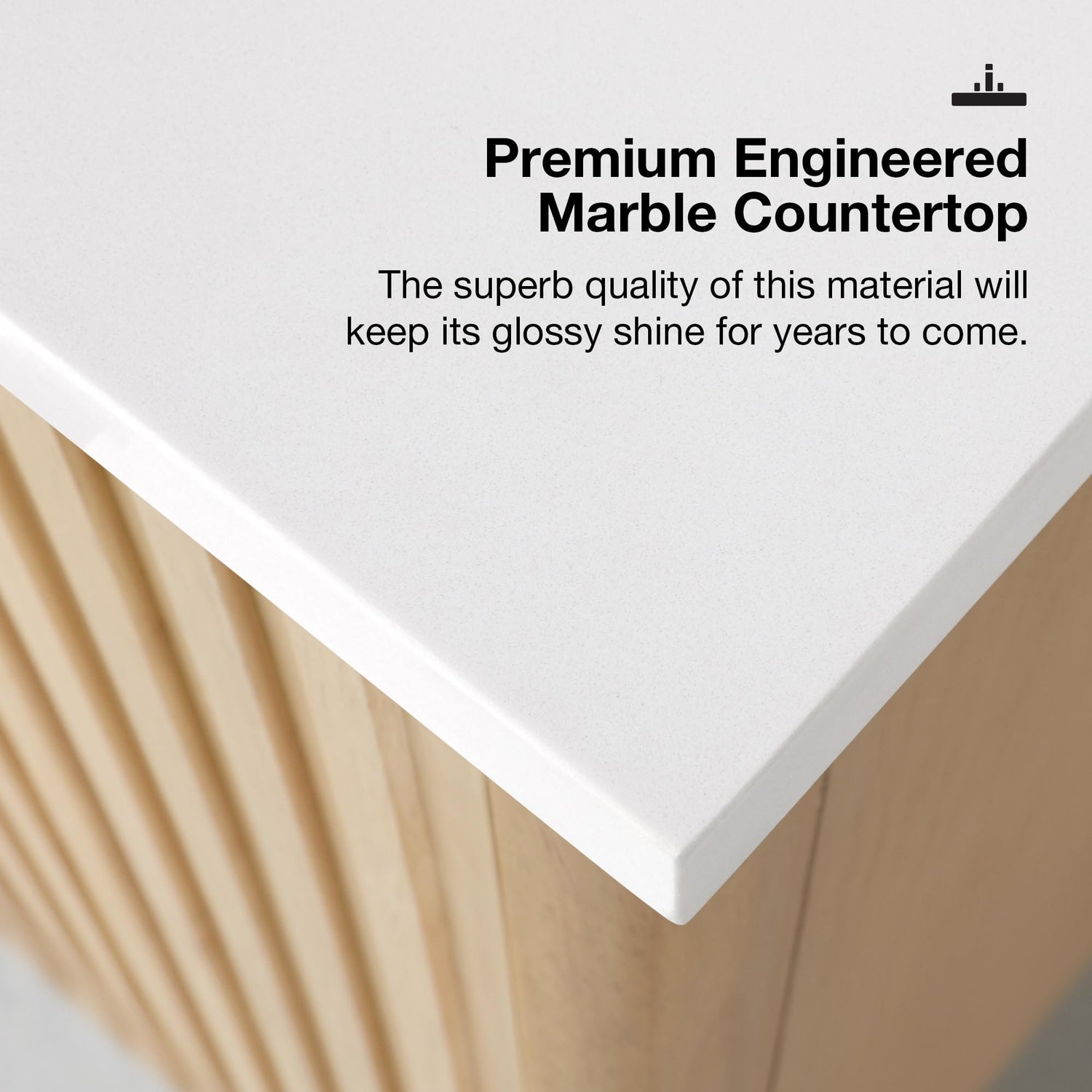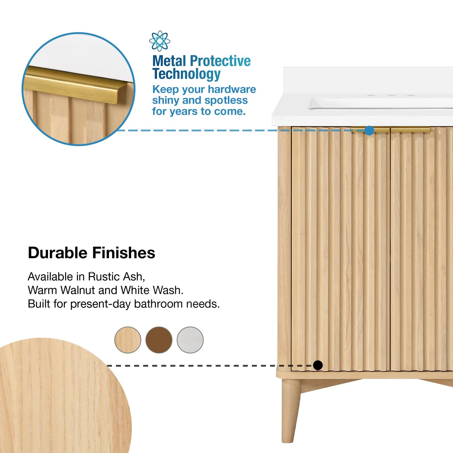 - Rustic Ash finish vanity with brushed gold hardware included. White engineered marble countertop with straight edge and removable backsplash