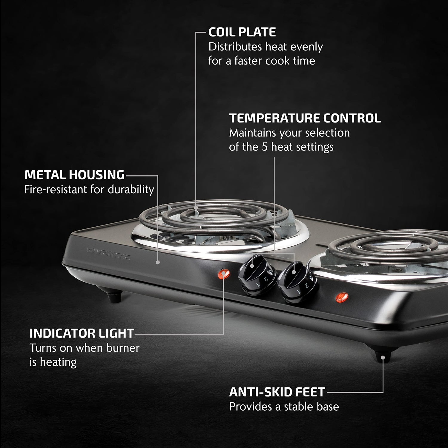 Details: Discover how quick and hassle-free it is to cook meals with the OVENTE Electric Double Coil Burner. This hotplate has a 6-inch and 5.75-inch durable stainless-steel heating tube and a fire-resistant metal housing that can last for years. Features a 1700 wattage (120 volt) that heats up quickly with low, medium, and high temperature settings for your everyday needs, which is ideal for efficiently cooking all kinds of dishes. From small family gatherings to large holiday events, fiesta or simply entertaining friends either its breakfast, lunch or dinner this double coil burner will surely come handy.