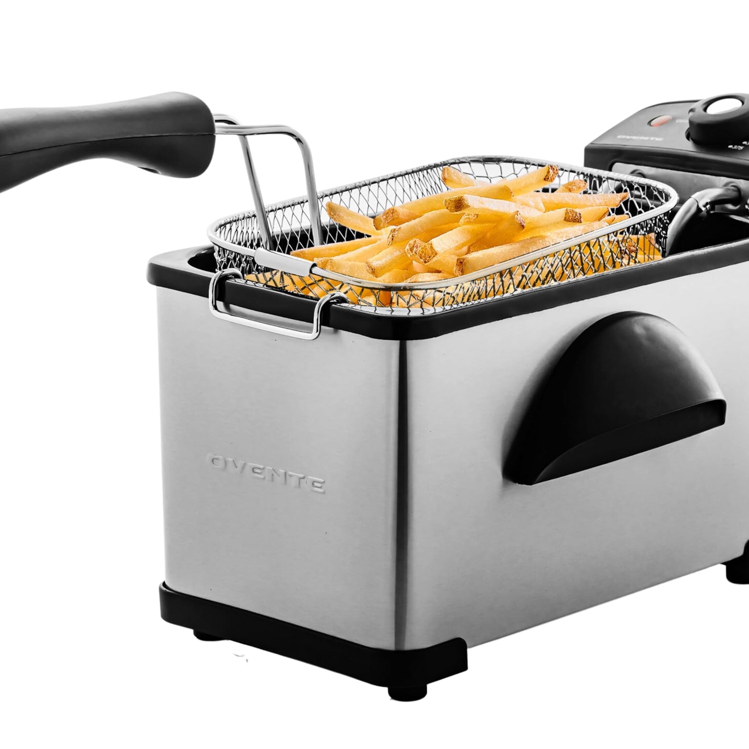 OVENTE Electric Deep Fryer 2 Liter Capacity, 1500 Watt Lid with Viewing Window and Odor Filter, Adjustable Temperature, Removable Frying Basket and Easy to Clean Stainless Steel Body, Silver FDM2201BR