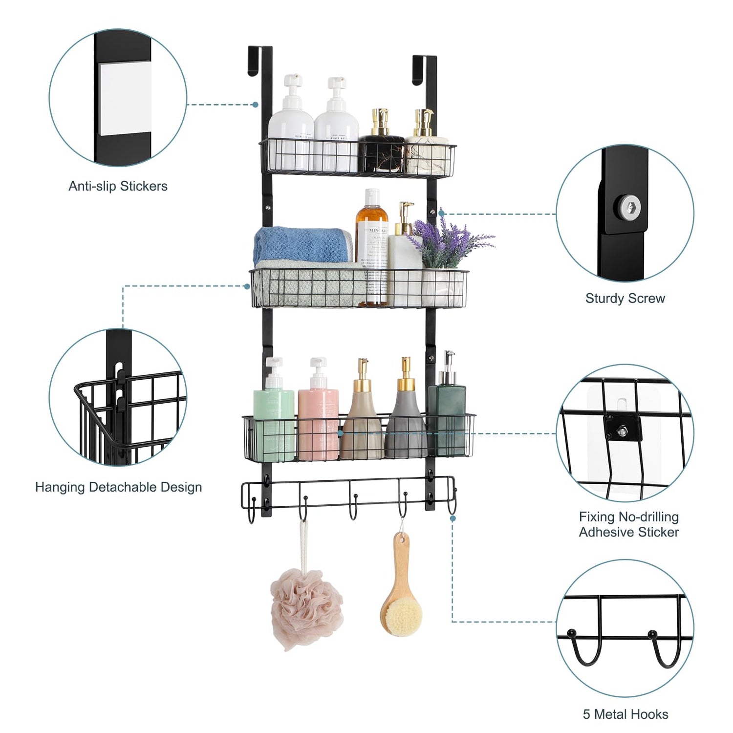 - 【Sturdy Frame】The over the door shelf has detachable design, which makes you and your families use it easily and convenient to move. Anti-rust performance avoids to damage and can be used for a long time. A sticker pad is attached to the back of the biggest basket to keep the pantry door organizer with hooks sturdier. 6 stickers will add the stability between door and the bathroom door organizer. Not worrring about shaking and falling, safe to use.