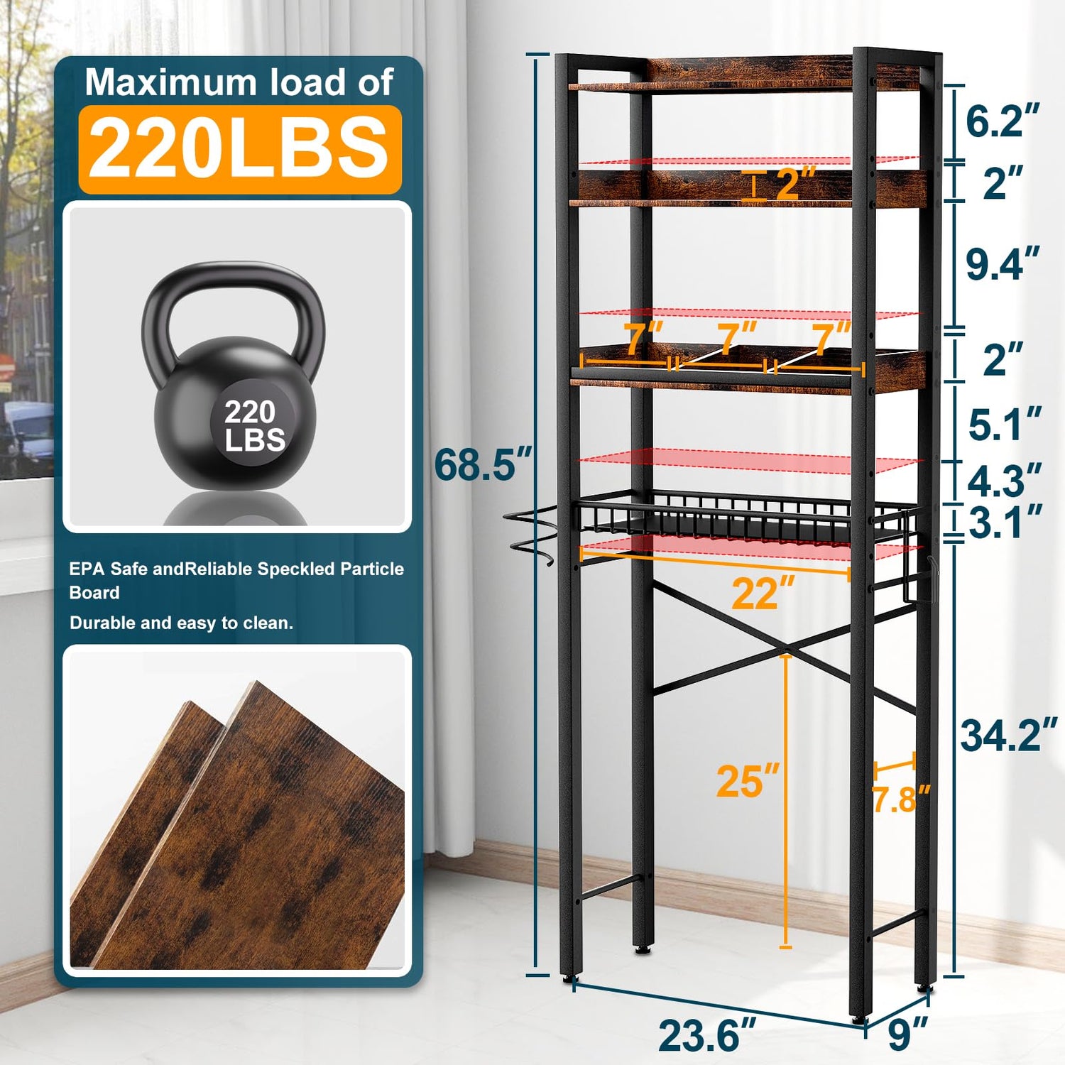 - Adjustable and Space-saving: The overall size of the rack is 23.6 x 9.4 x 68 inches. Featuring three adjustable shelves, you can customize the distance between shelves to accommodate items of various heights, maximizing storage capability. Large base area Maximum adjustable height of 41 inches. suitable for most of the regular-sized toilets without hindering the opening of the toilet lid.You can also place it in bathroom or laundry room.