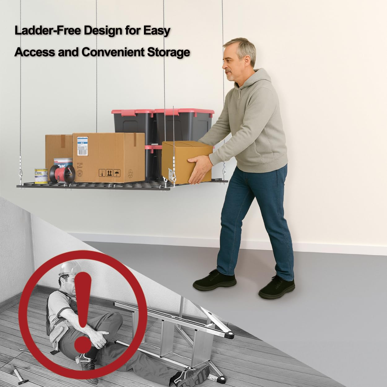 - Innovative Design for Easy Access: Elevate your garage organization with this overhead garage storage lift. Unlike traditional garage storage shelves, our product allows for effortless access, making storing and retrieving items a breeze, without the need for ladders.