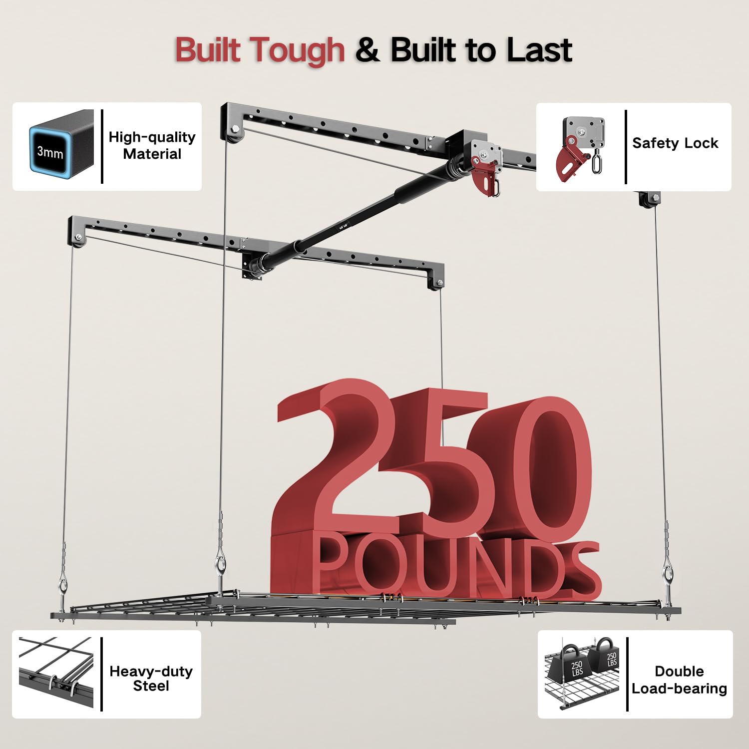 - Added Manual Lock for Maximum Safety: Our garage storage lift system comes with an additional manual lock, offering an extra layer of security. This feature ensures that your belongings are securely stored and steadfastly held in position, giving you peace of mind.
