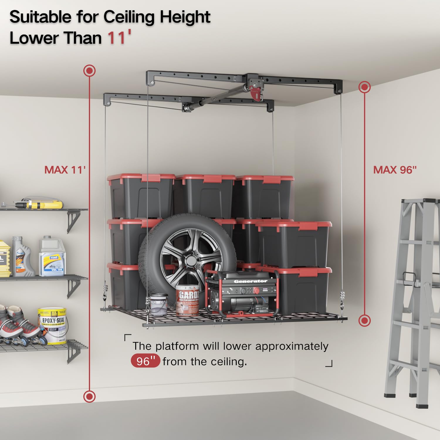 - Innovative Design for Easy Access: Elevate your garage organization with this overhead garage storage lift. Unlike traditional garage storage shelves, our product allows for effortless access, making storing and retrieving items a breeze, without the need for ladders.