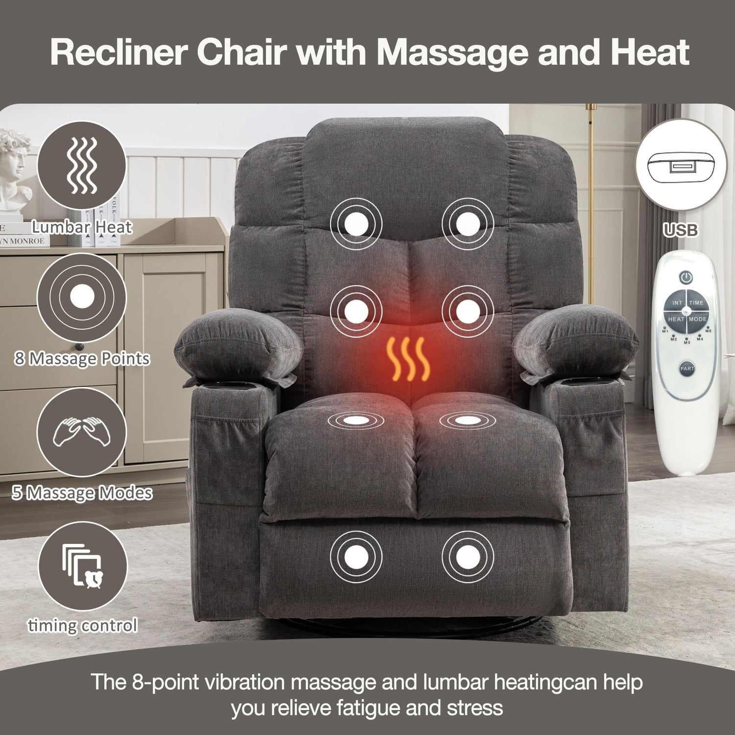 Oversized Massage Swivel Recliner Chair with Lumbar Heating for Living Room Rocker Recliner Single Sofa with Cup Holders and USB Charge Port, Large Big Chair Recliners for Adult