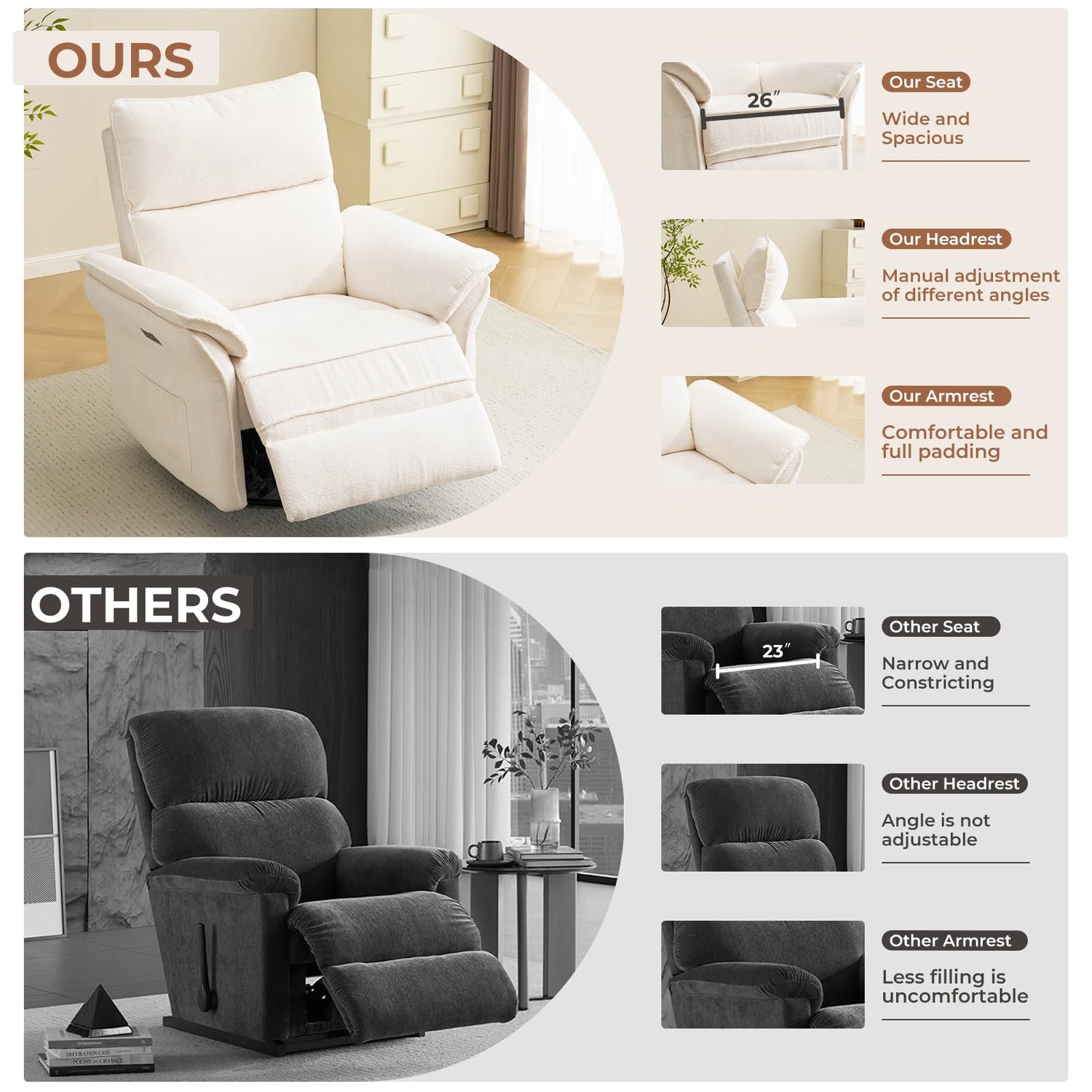 - Power Recliner and Swivel Rocker:This recliner chair offers the convenience of power reclining, Allowing you to easily adjust the seating position at the touch of a button. Spin in style with 270-degree swivel base, Provide better relaxation experience 30°rocker function finding the right relaxation position for you.