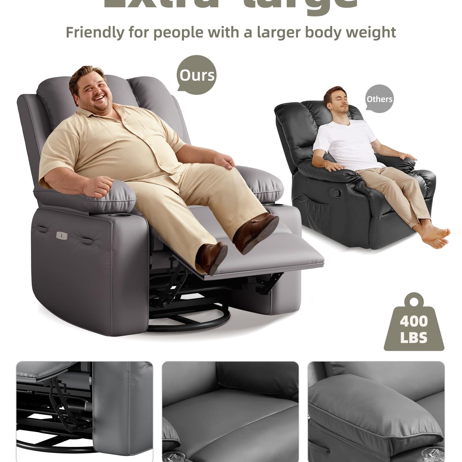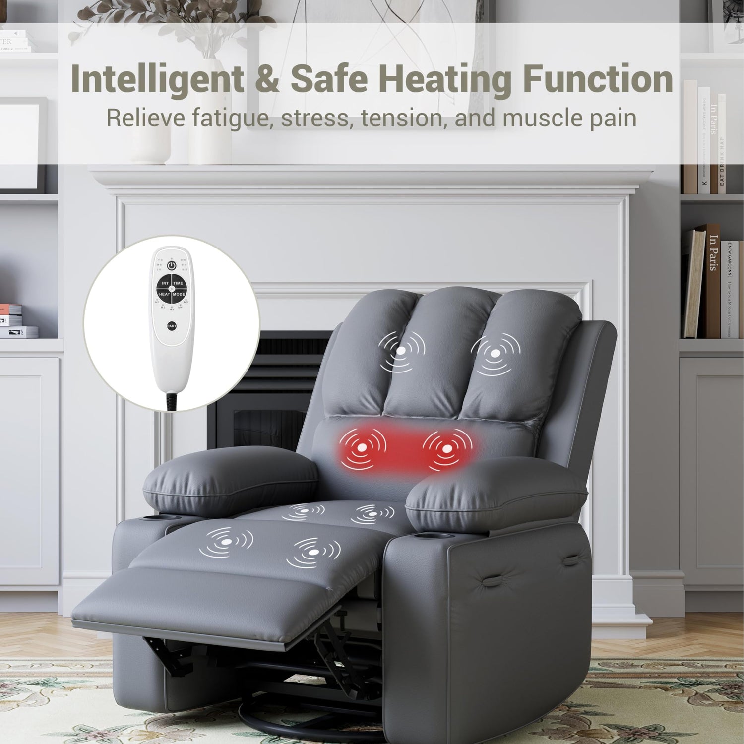 Oversized Power Recliner Chairs with Massage and Heat - 360° Swivel Faux Leather Rocking Chair for Adults with Cup Holder for Living Rooms, Bedrooms, and Nurseries - Grey