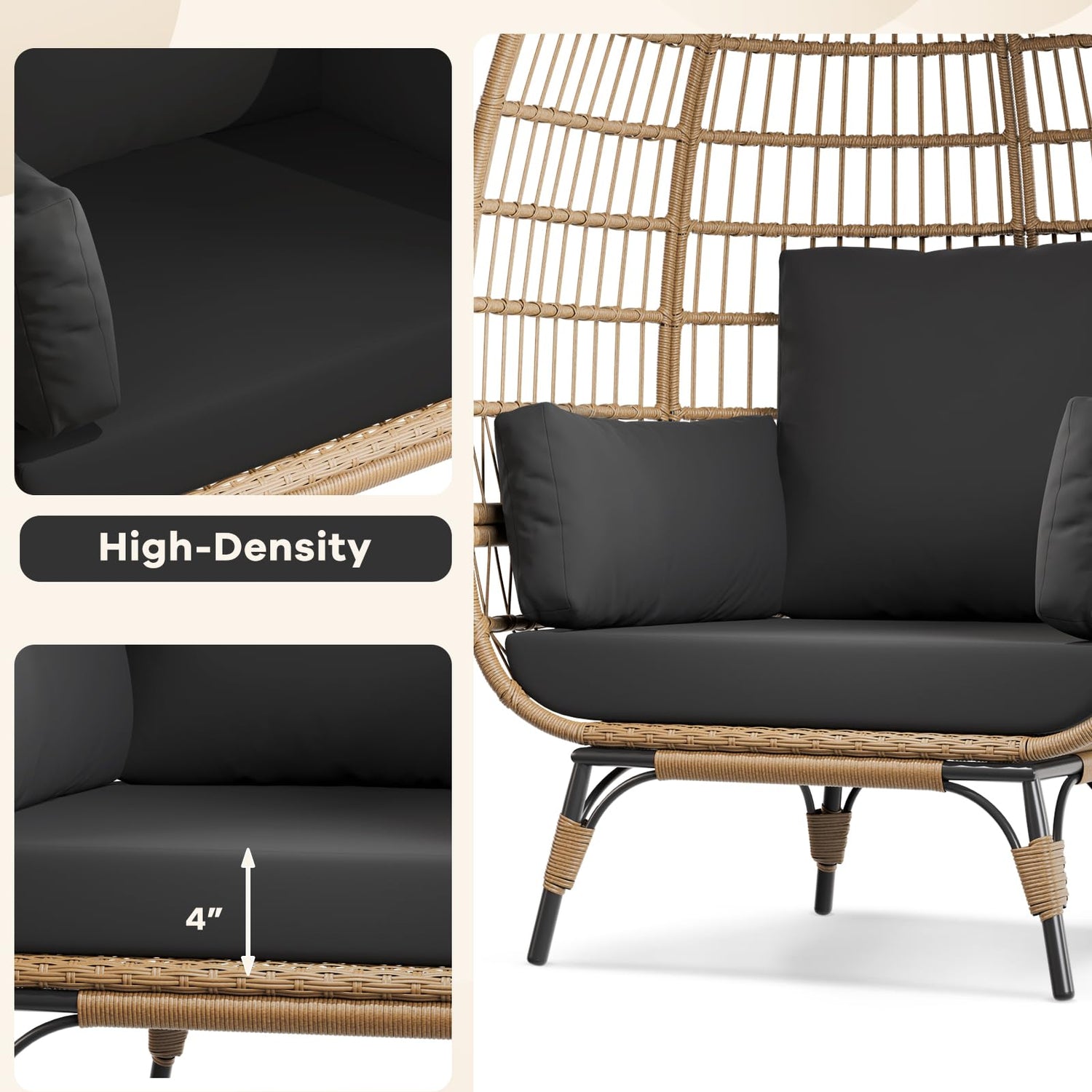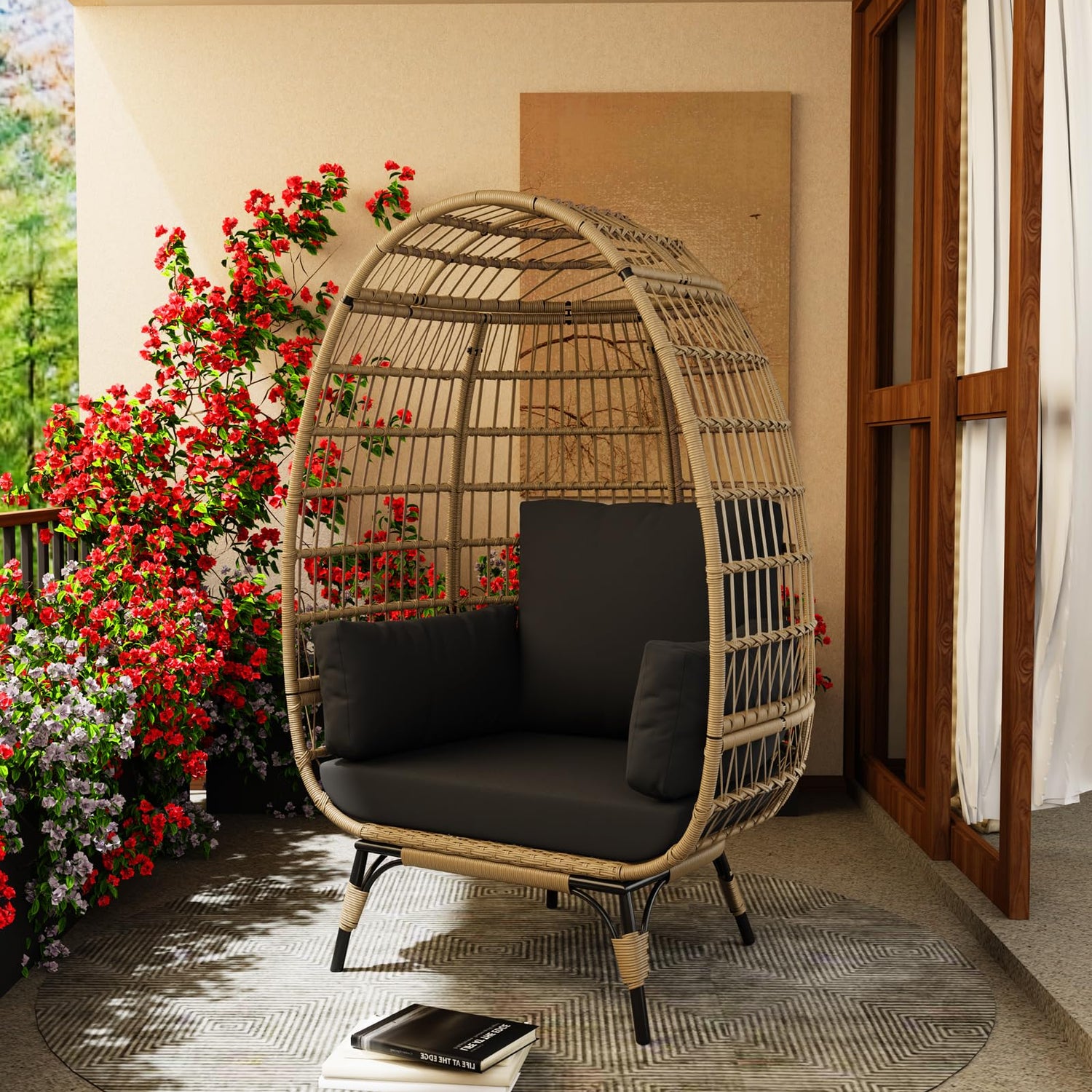 Oversized Wicker Egg Chair Outdoor, Patio Lounge Chair with Ultra Luxury Cushions & Steel Frame, 350LBs Capacity Egg Chair Indoor Outdoor for Balcony, Patio, Living Room, Black