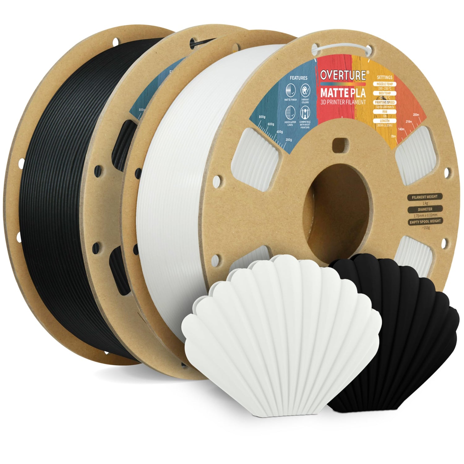 OVERTURE 2KG Bundle Matte PLA 3D Printer Filament 1.75mm, Matt Surface & Low Warping Filament 2 Pack 1kg Spool (2.2 lbs), Fit Most FDM Printers (Matte Black & Matte White)