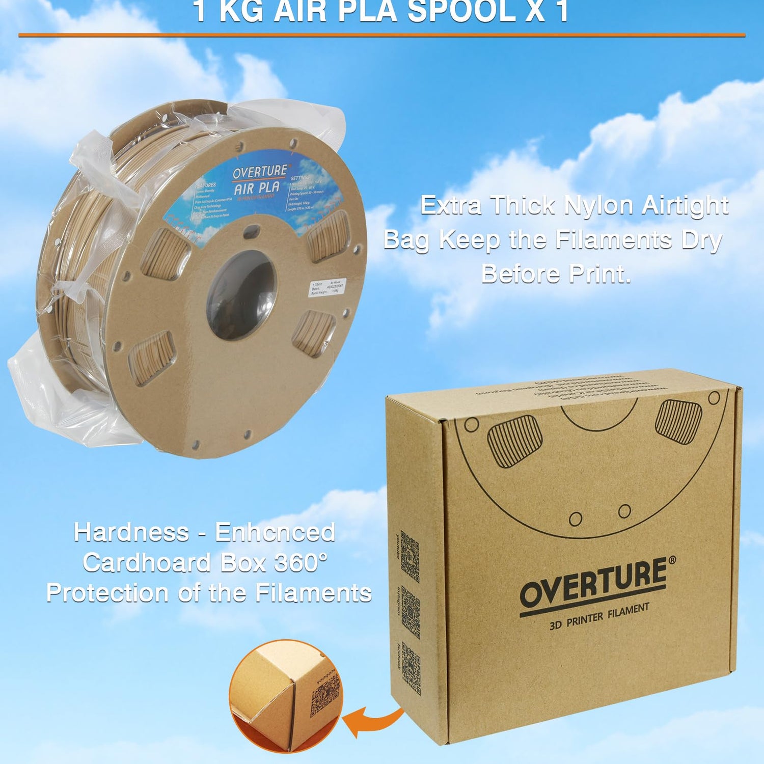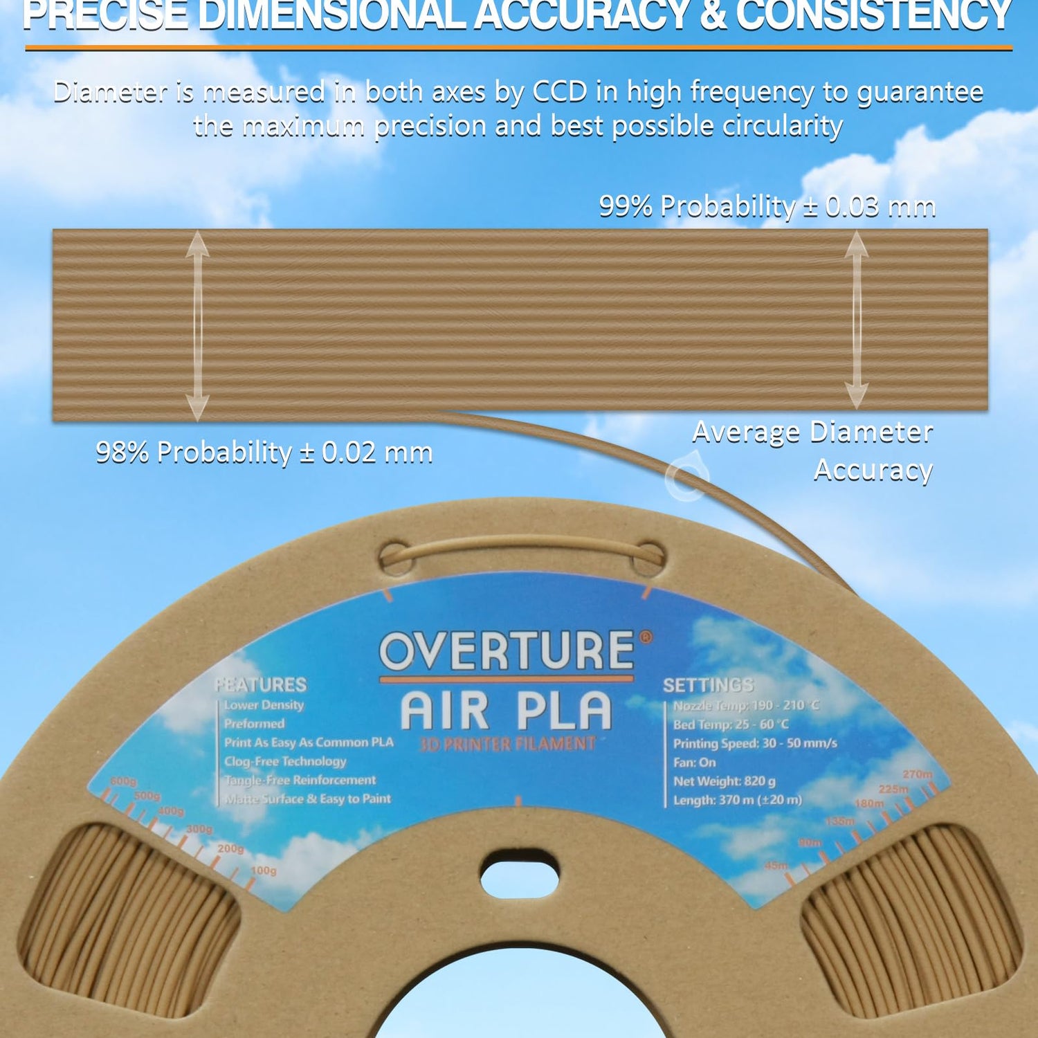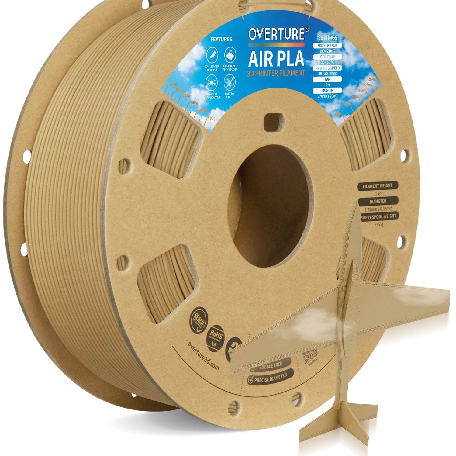 OVERTURE Air PLA Filament, Pre-Foamed PLA Low-Density, Lightweight PLA, Cardboard Spool, 0.82kg(1.8lbs), Dimensional Accuracy +/- 0.02mm (Wood)