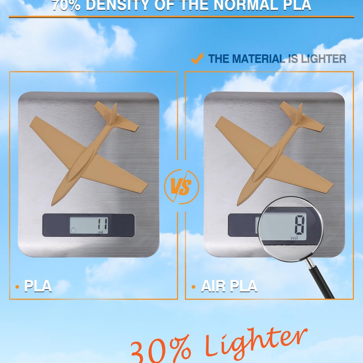 - 【Foaming Process】AIR PLA is a low-density foamed PLA, the foaming process allows the filament to have a lower density than ordinary PLA, making the print quality lighter (compared to about 80% of the weight of ordinary PLA)