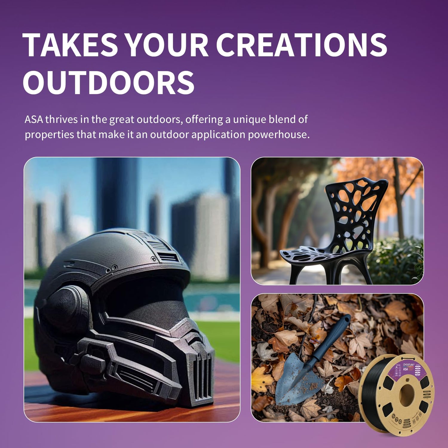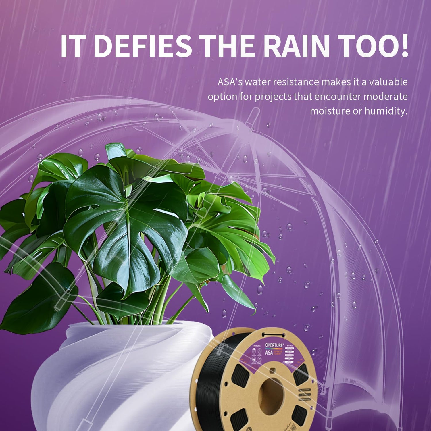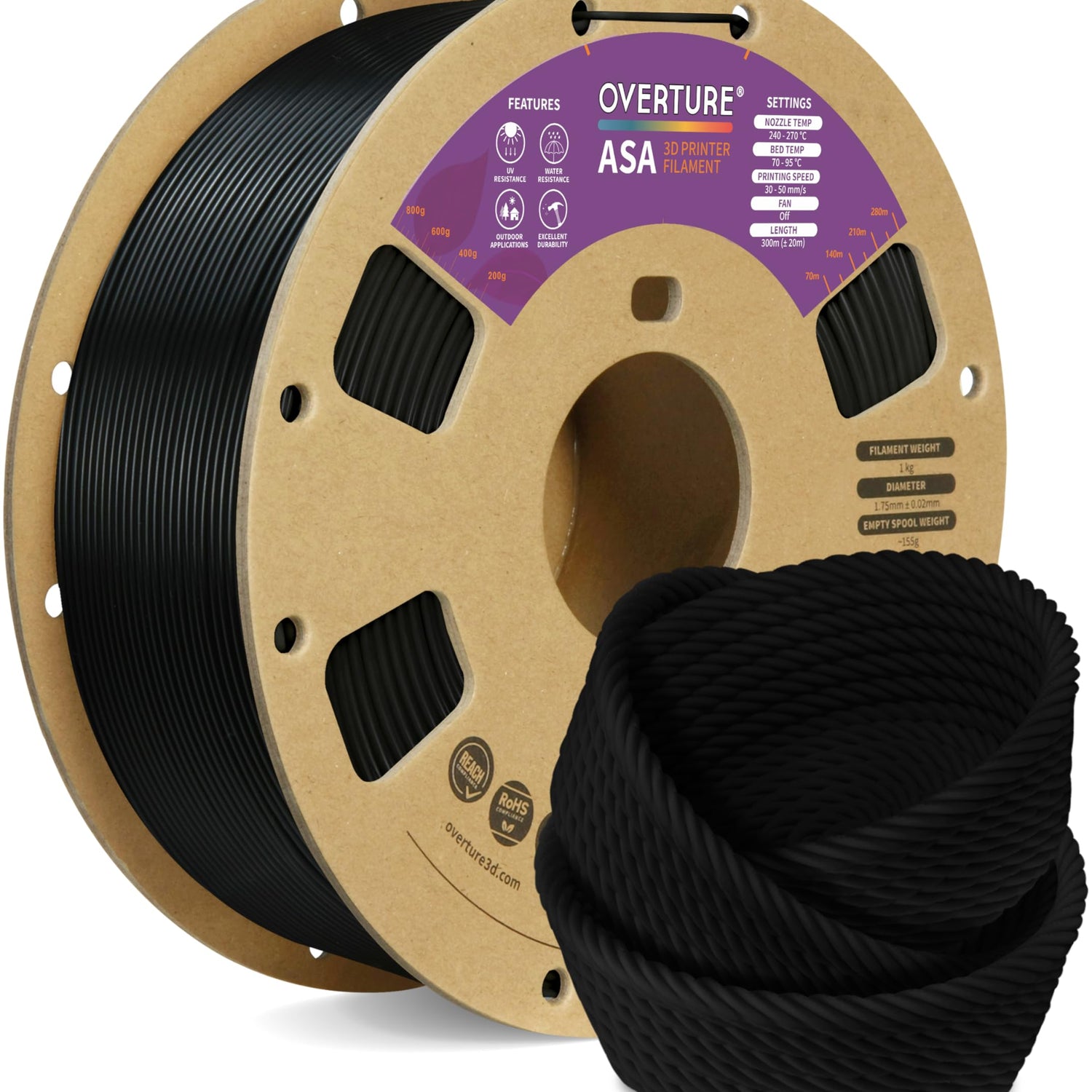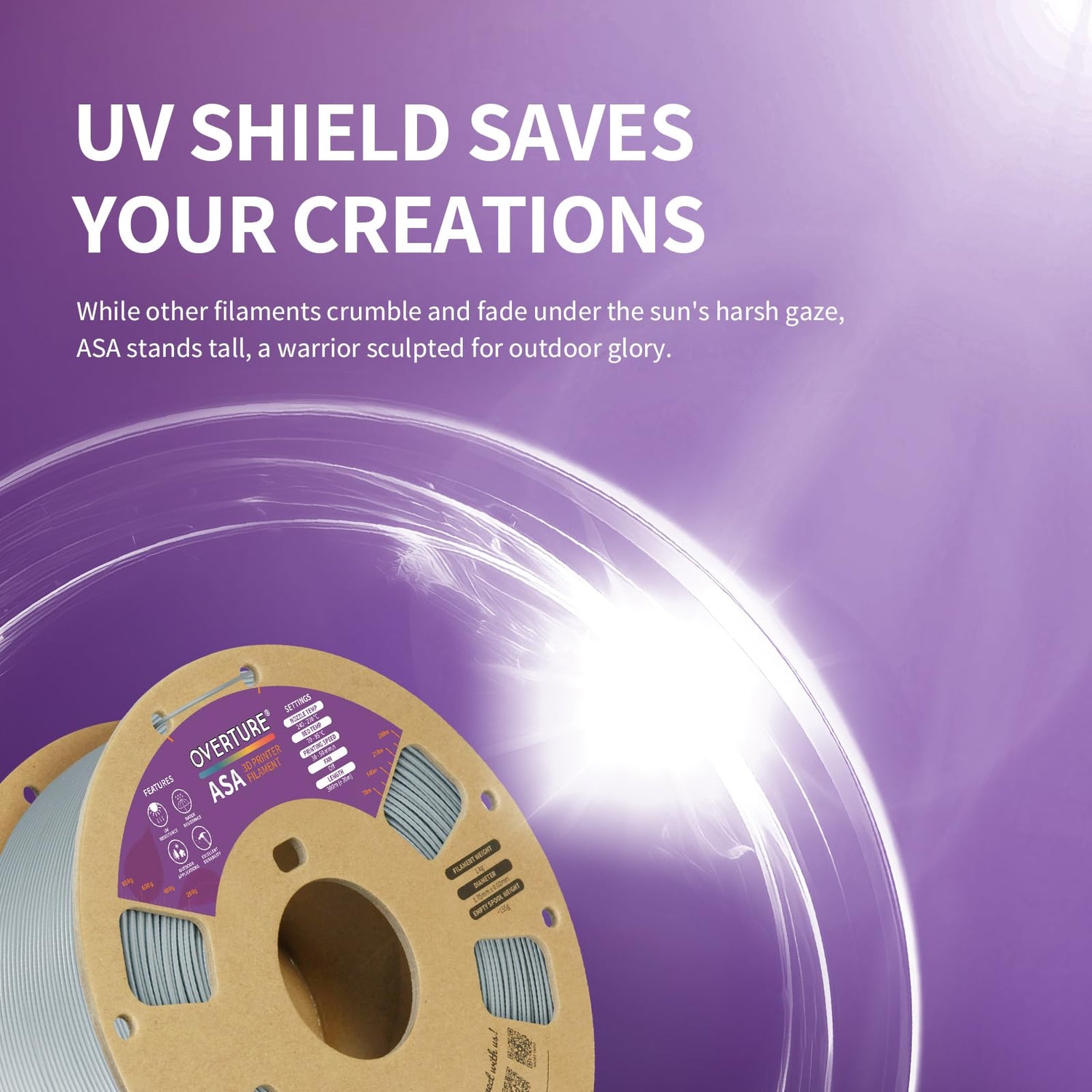 - 【Weather resistance & Heat resistance】OVERTURE ASA filament is specially formulated to provide excellent protection against UV rays. It also exhibits excellent temperature resistance, ensuring stability and durability in different temperature environments