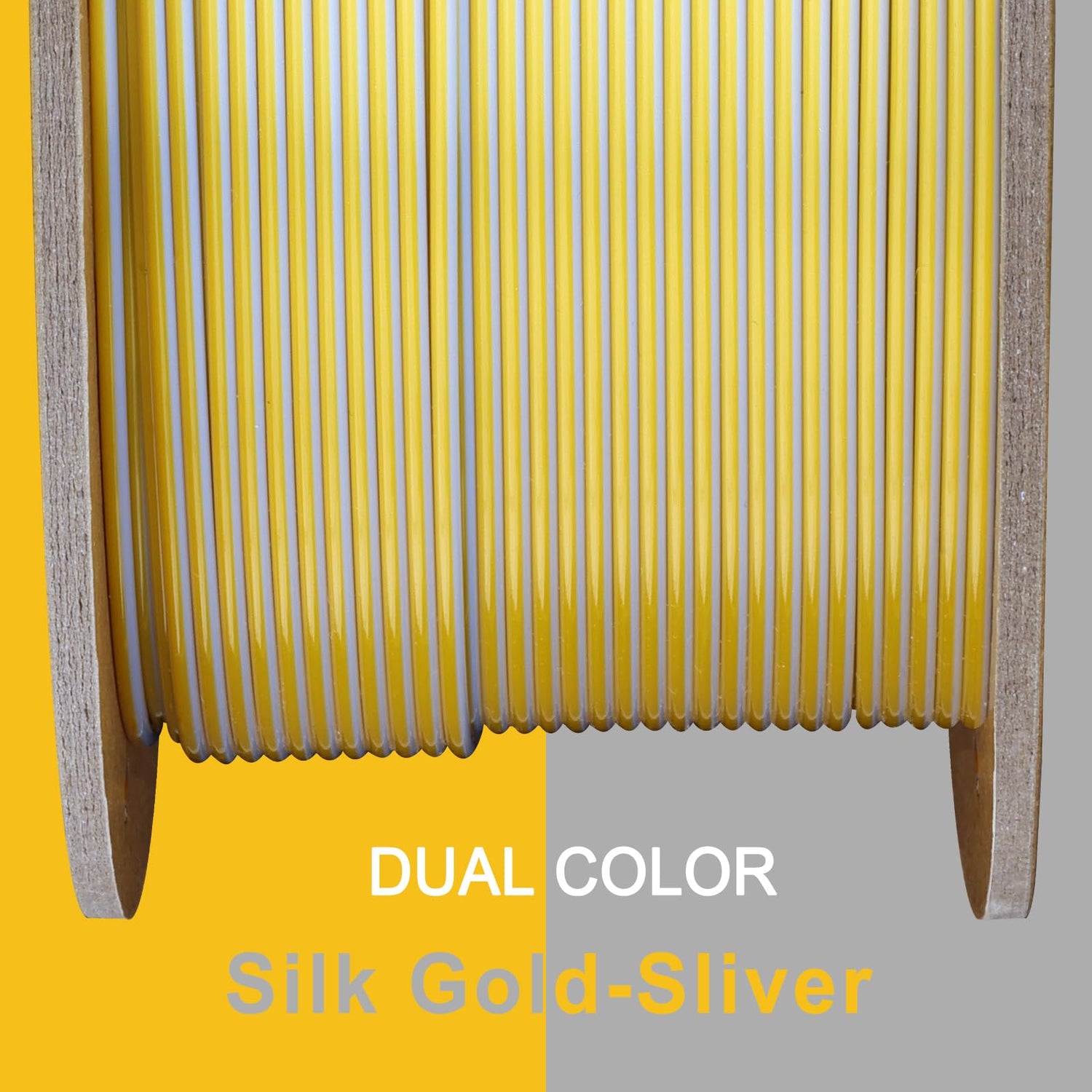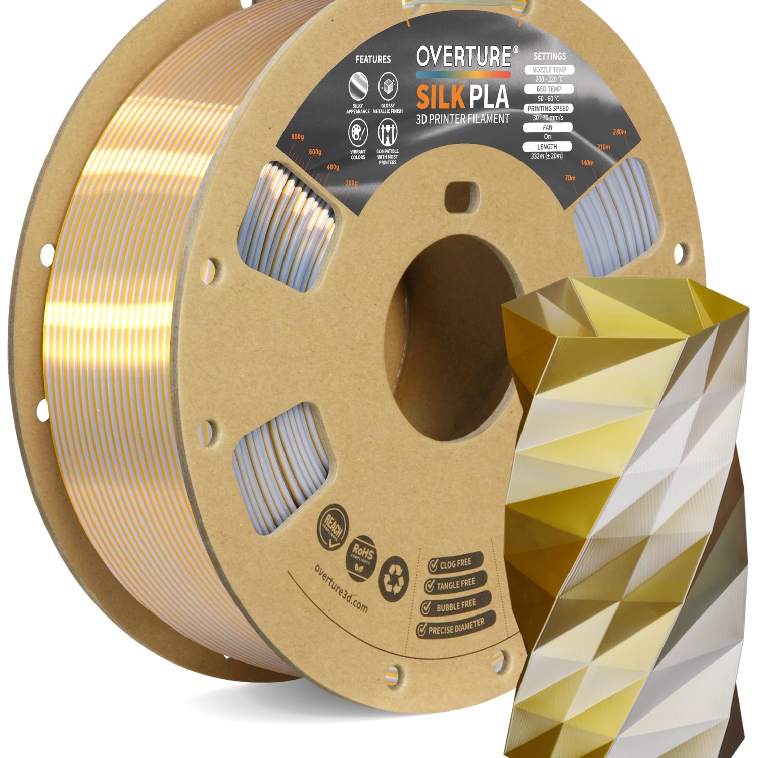 OVERTURE Silk PLA 1.75mm Dual Color Filament, Clog-Free Shiny 3D Printer Filament, 1kg Spool(2.2lbs), Dimensional Accuracy +/- 0.02 mm, Fit Most FDM Printer(Silk Gold-Silver)