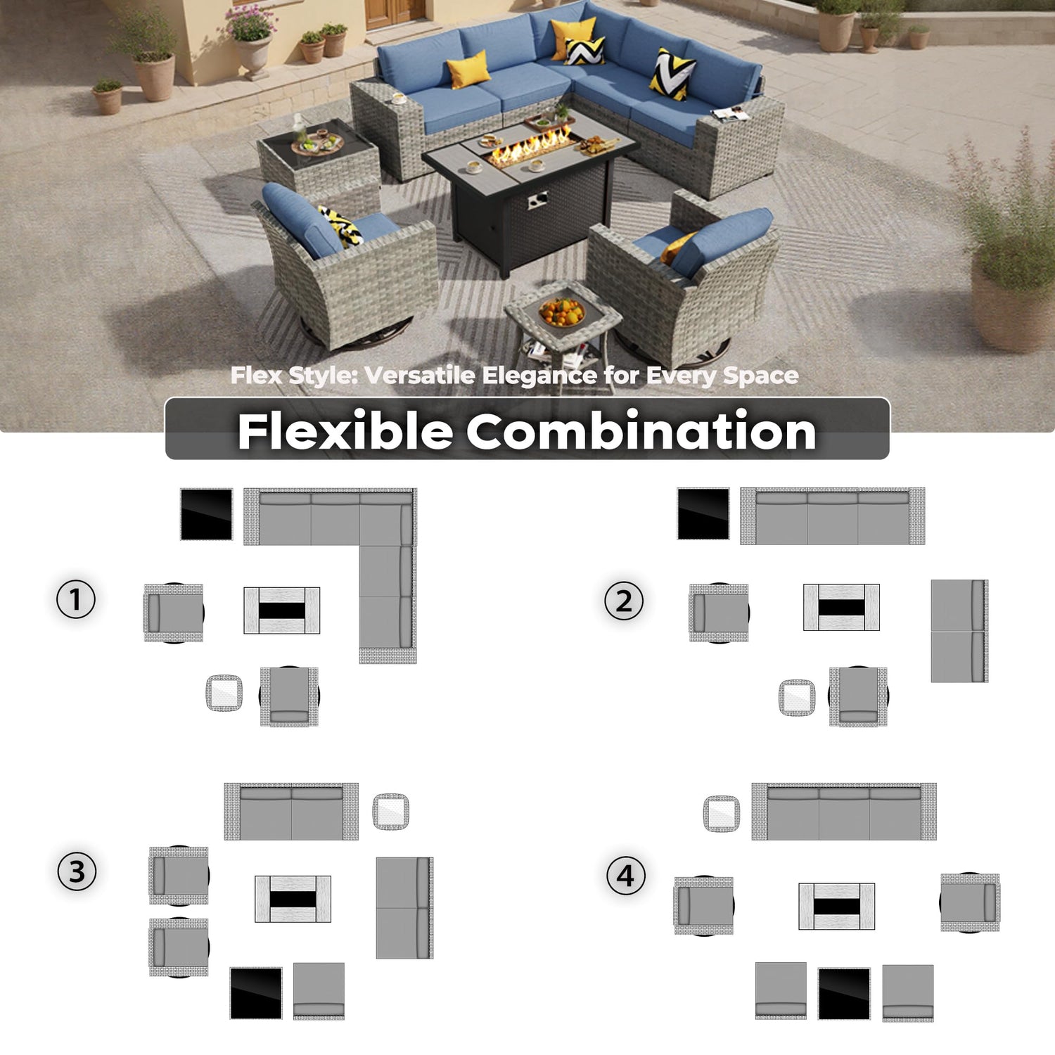 ovios 10 Pieces Patio Furniture Set, Outdoor Wicker Sectional Sofa with 42" Fire Pit Table Swivel Chairs, Modern Modular Deep Seat Rattan Couch Conversation Sets, Denim Blue