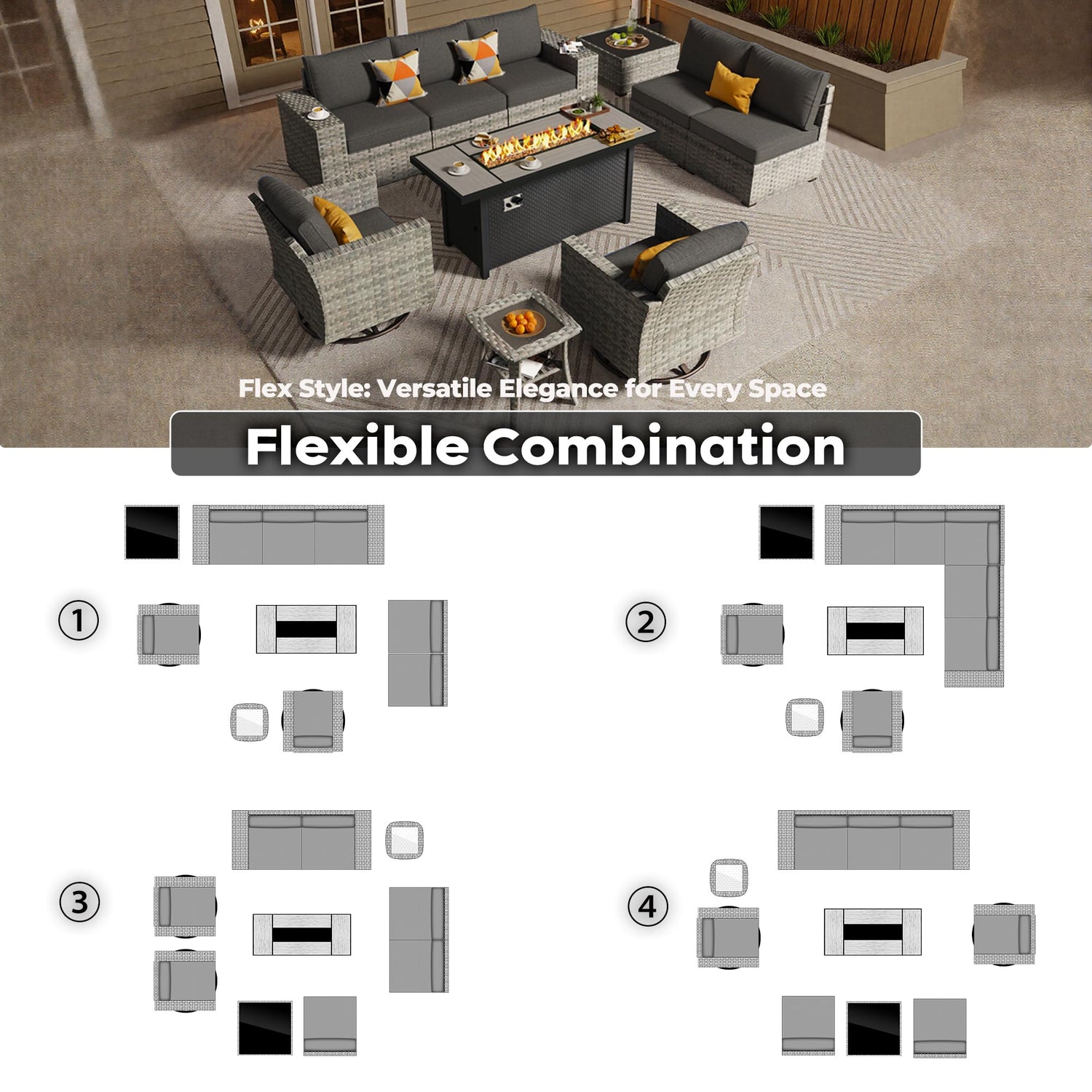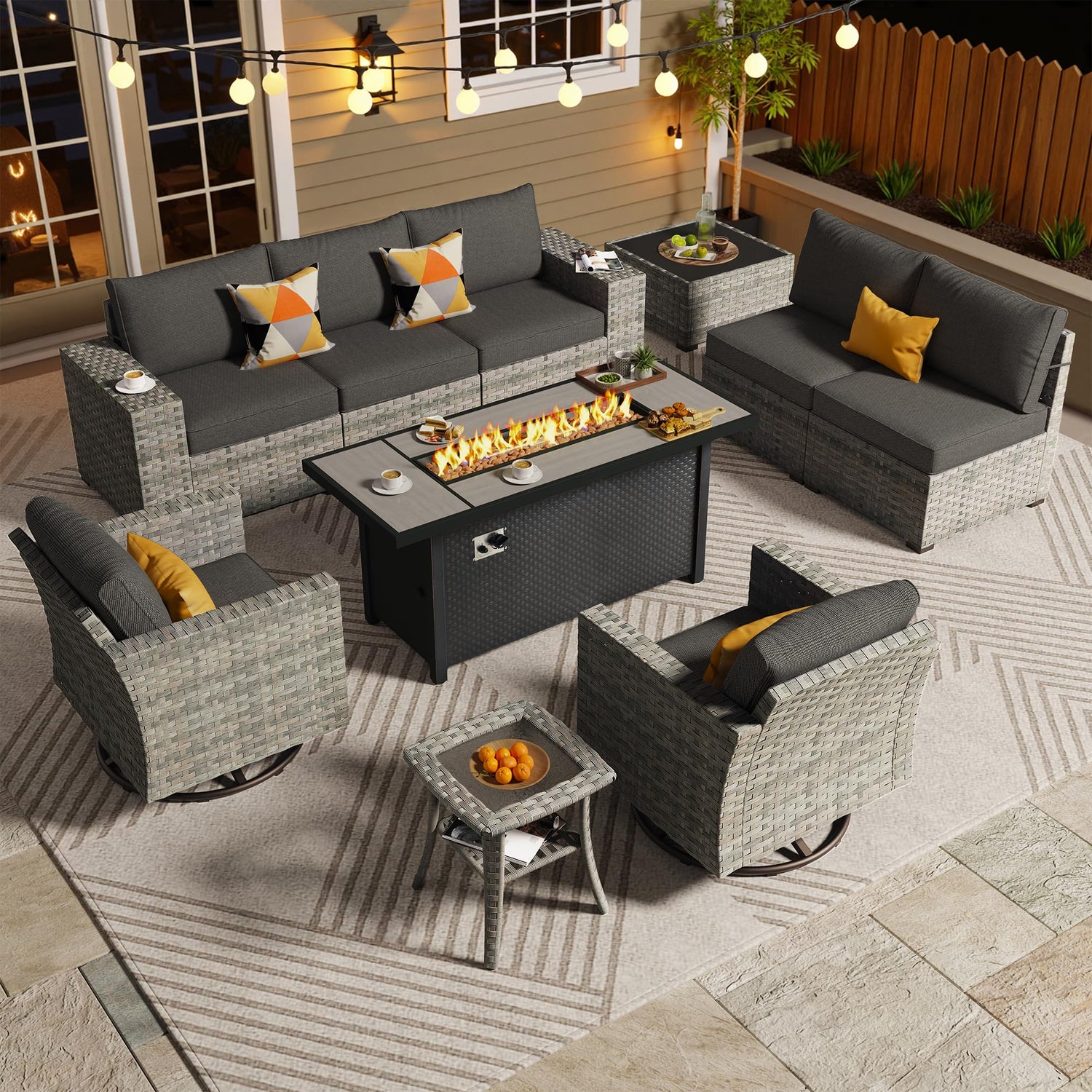 ovios 10 Pieces Patio Furniture Set, Outdoor Wicker Sectional Sofa with 54" Fire Pit Table Swivel Chairs, Modern Modular Deep Seat Rattan Couch Conversation Sets, Black