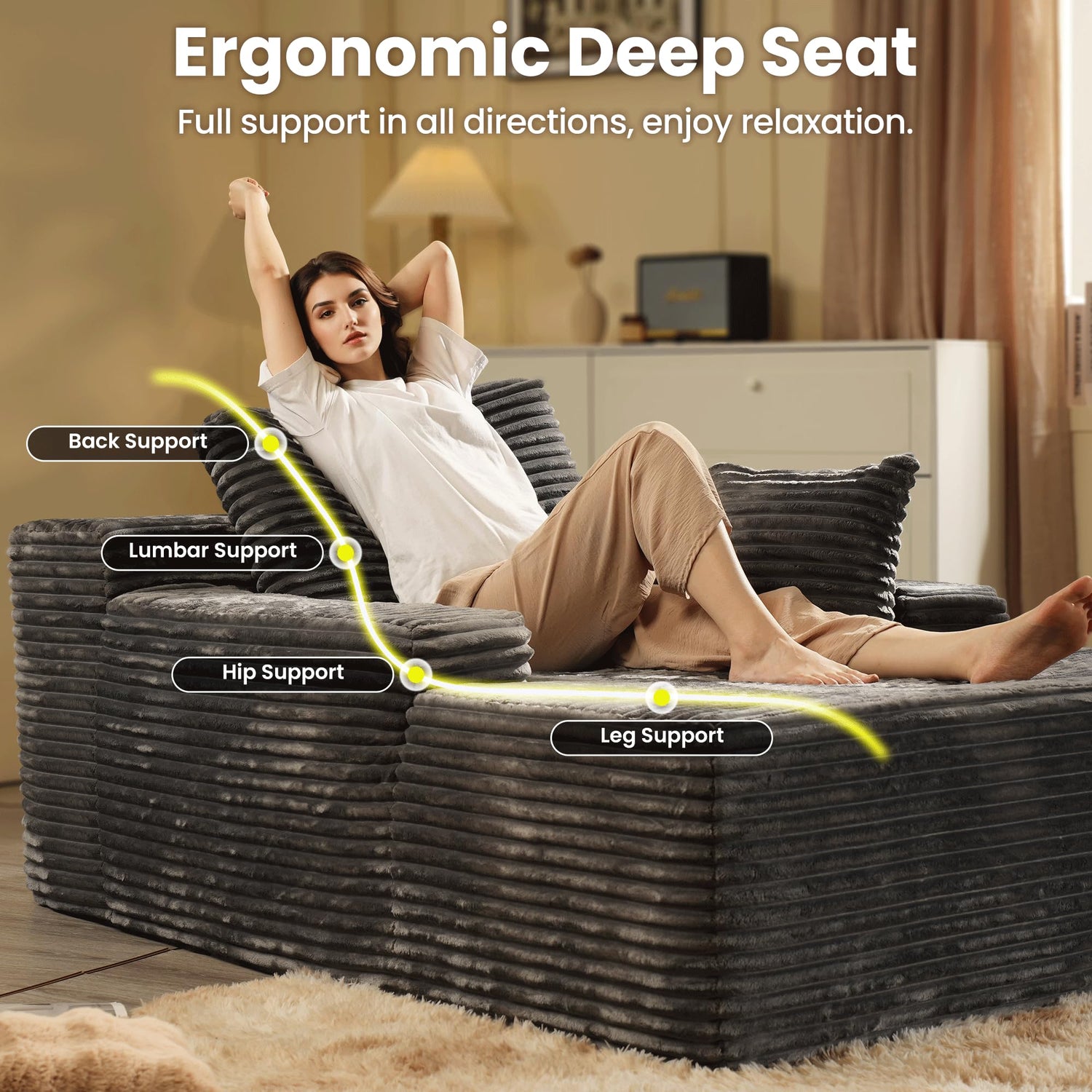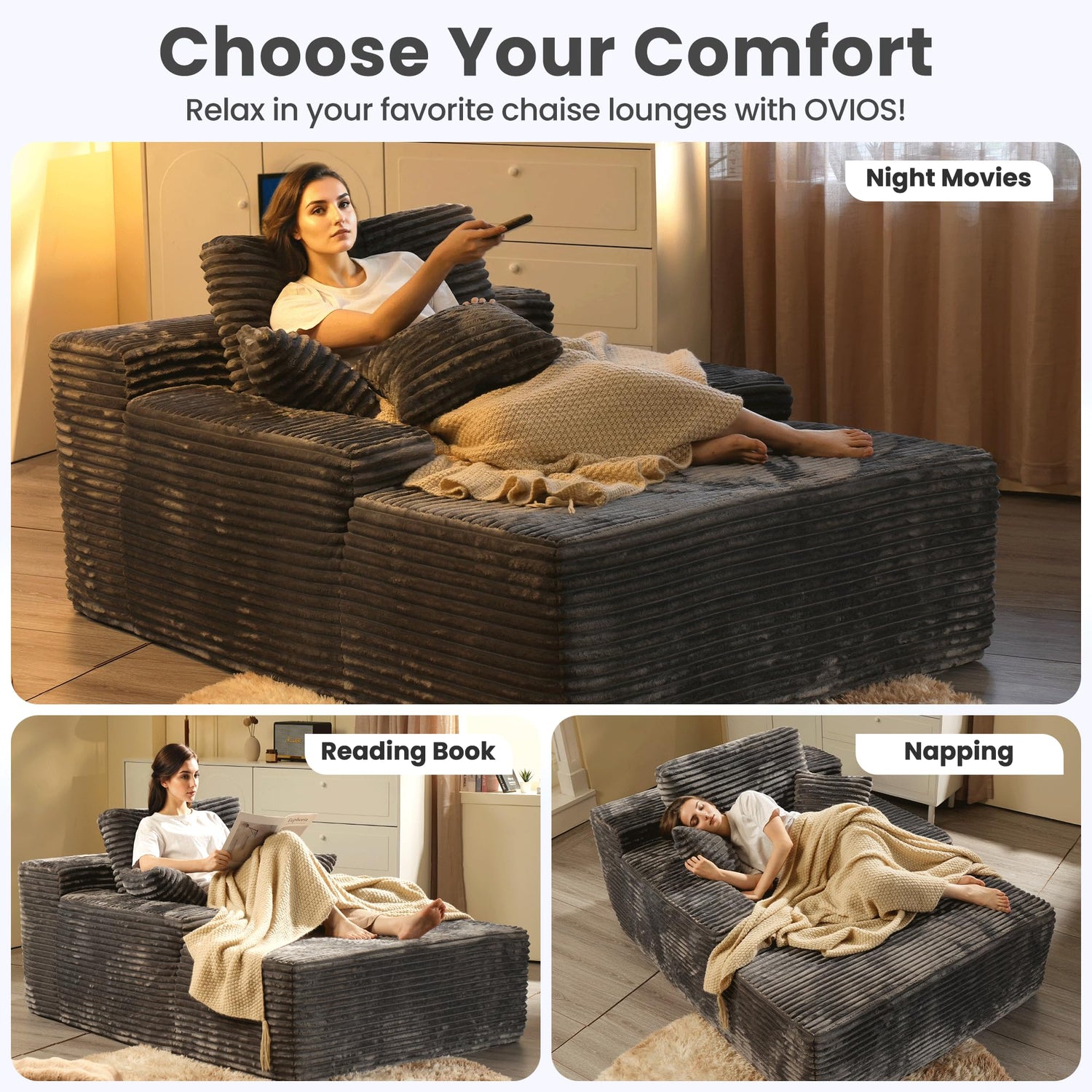 - Deep Seat Chaise Lounge: The oversized chaise lounge sofa couch with spacious sleeping area is enough to meet your and your family's needs. You can curling up, watching night movies, reading a book, or napping on the sofa, whether you are tall or like to stretch your body freely, you can find the most comfortable sitting or lying position on this big comfy chair in living room, bedroom, home theater room, it can be a versatile seating option that ensures an enjoyable and relaxing experience