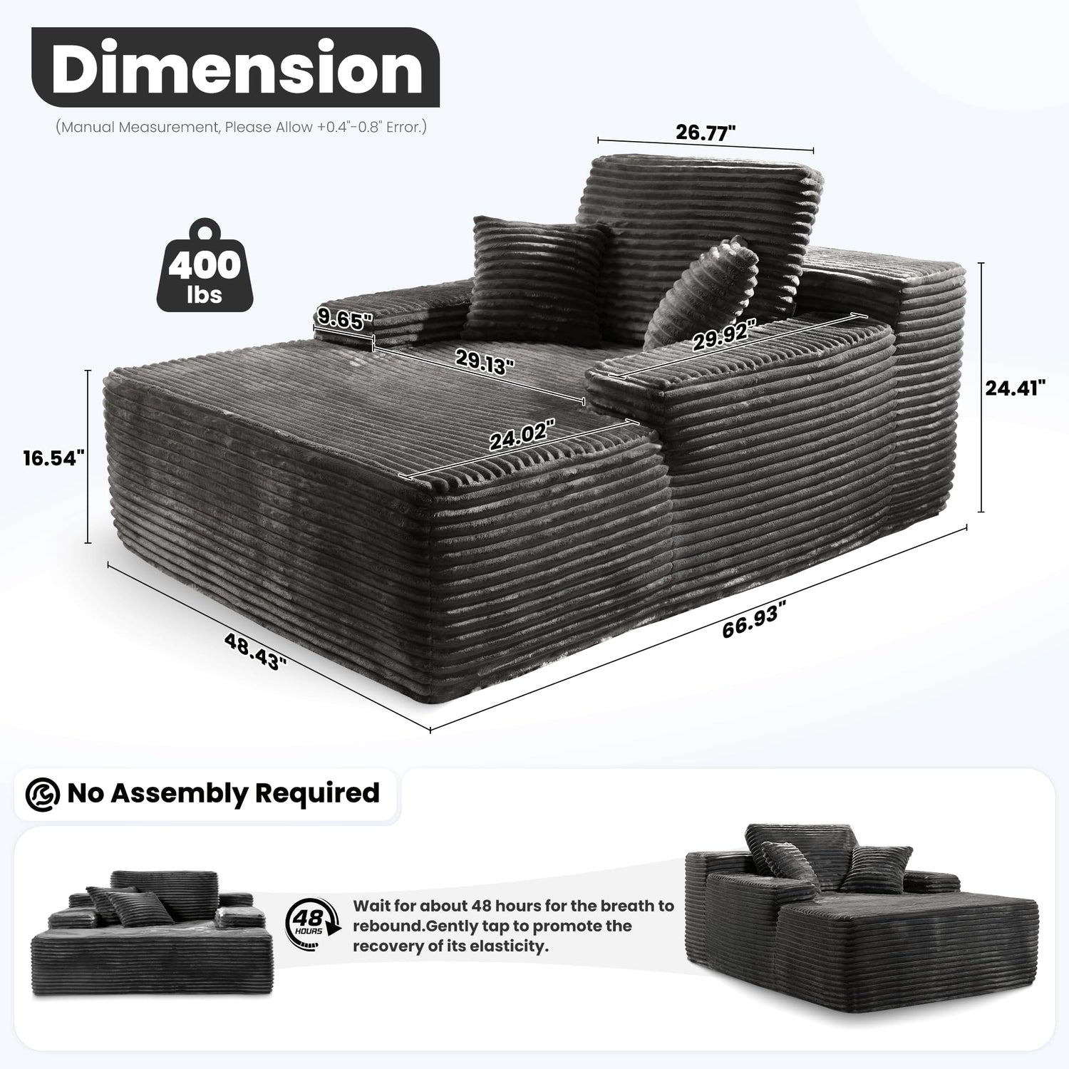 - No Assembly Required: Get rid of the hassle of typical furniture installation with our chaise lounge chair. Our giant sofa couch with cushions and pillows is packed in vacuum compression. Please leave it alone for 48-72 hours after receiving and opening so that the sponge can fully expand. Simply disassemble all parts and gently tap each section to restore its elasticity and fluffiness. Full recovery may take about 24-48 hours
