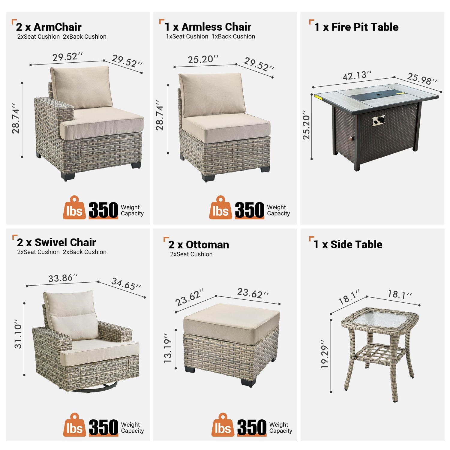 - Conversation Set:This outdoor sectional sofa set is designed with a 2 * armrest chairs, 1 * armless chairs, 2 * ottoman, 2 * swivel chairs, 1 * 42" fire table, 1 * lighting coffee table, 1* side coffee table, 7 pillows, and 5 cushions, making it perfect for relaxation for 5-7 people. The classical brown rattan design makes it perfect for use in the backyard, poolside, deck, or any other indoor or outdoor location