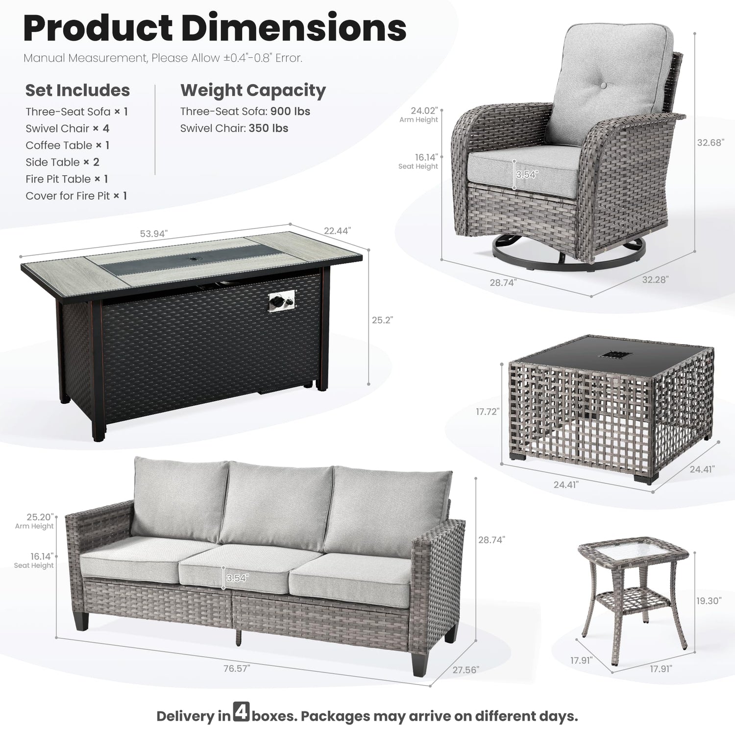 ovios 9 Pieces Patio Furniture Set, Outdoor Wicker Sofa Couch with Rocking Swivel Chairs Fire Pit Table, Modern Deep Seat Rattan Conversation Sets for Porch Deck, Dark Grey