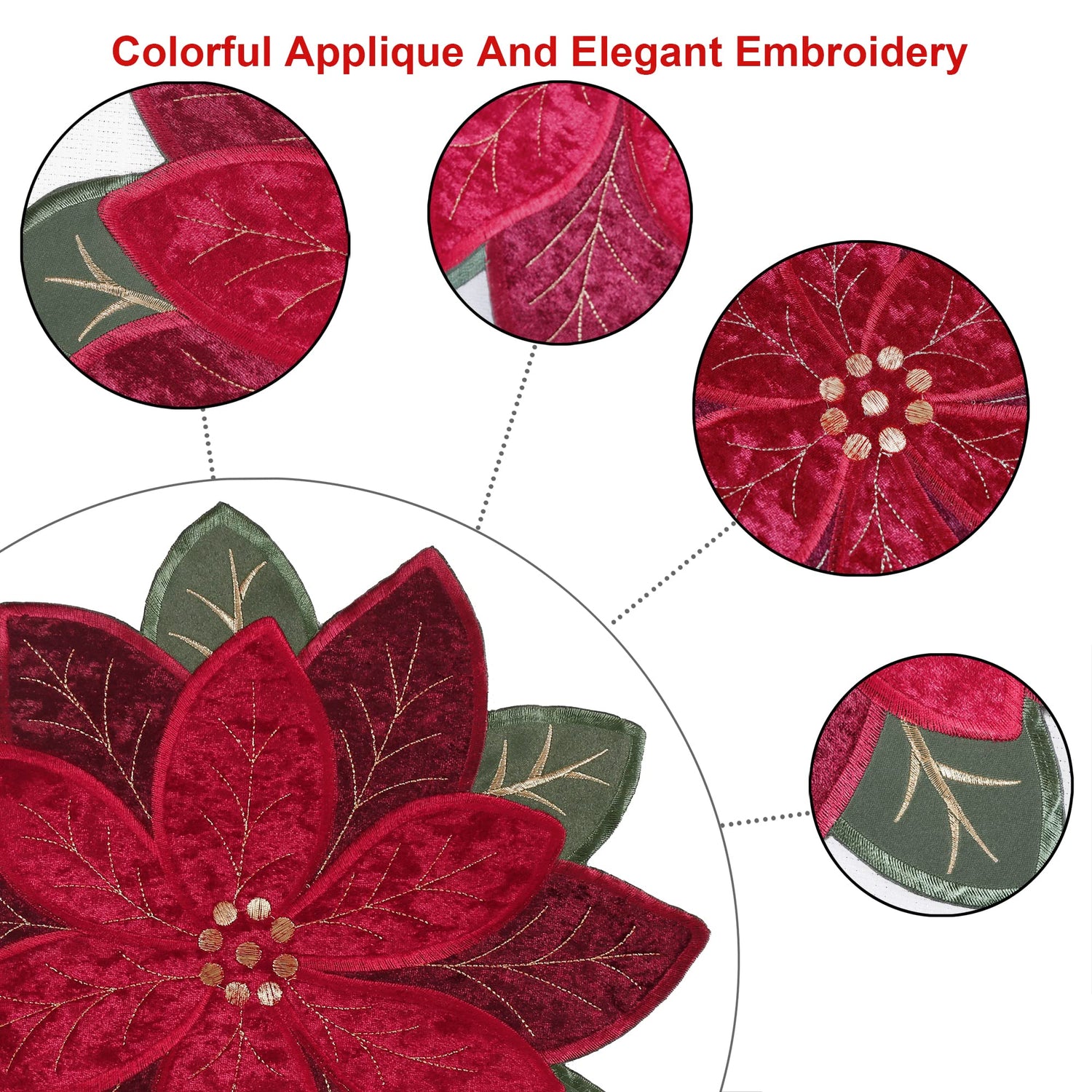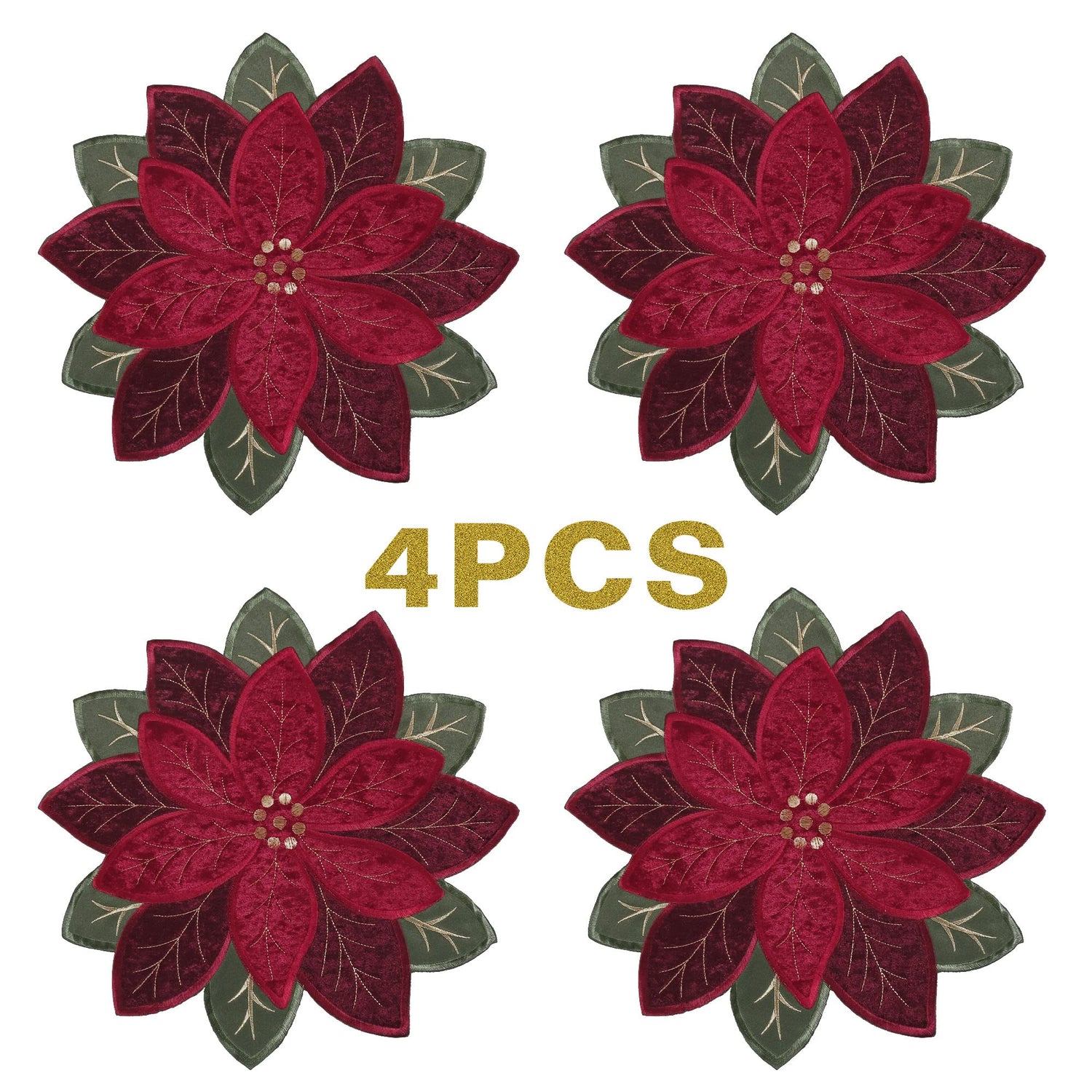 - [FEATURE]--Our Christmas table placemats use three layers applique and embroidery. The red and burgundry poinsettia flower Made with great quality polyester velvet. They guarantee the softness and comfortable touch. Bright colors of red poinsettia and burgundry poinsettia flower and green leaves, adding a luxury and fresh touch for your Christmas dining table. Made by our Oeko-Tex certified factory.