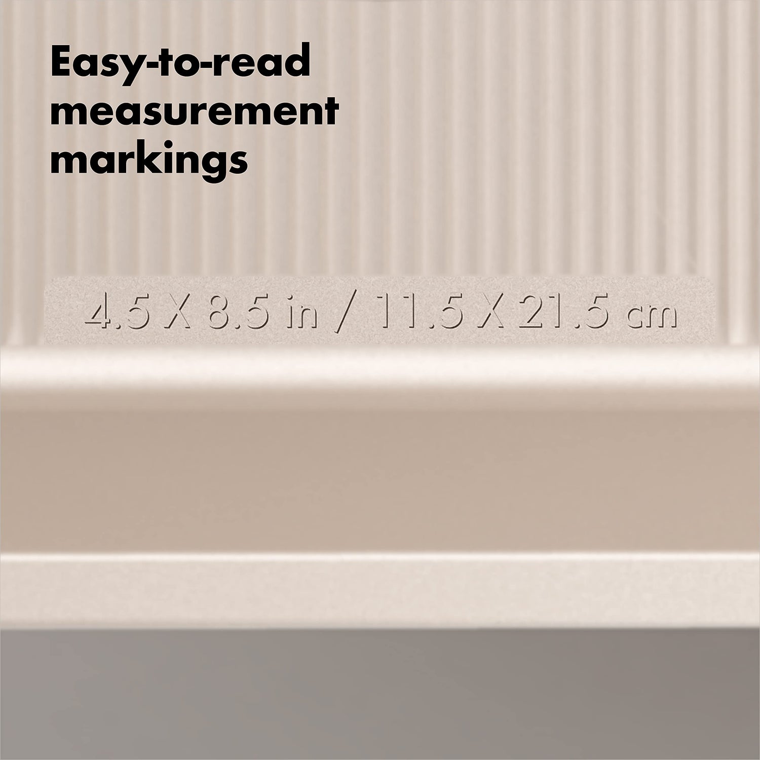 Product Description:OXO Good Grips Bakeware combines precise engineering with all the thoughtful touches that go into OXO products. Non-Stick Pro Bakeware is made from durable, heavy grade aluminized steel that promotes even heat distribution. Each piece features a commercial grade, double layer, ceramic reinforced PTFE coating that protects against scratching, staining, corrosion and abrasion. This dual function coating is ideal for both savory and sweet treats. The Nonstick line also utilizes a micro textured pattern to promote airflow and minimize surface contact for even baking. All OXO Good Grips Nonstick Pro Bakeware pieces feature square rolled edges for a secure grip, and are dishwasher safe. At 4.5 x 8.5 inches, the OXO Good Grips Non-Stick Pro 1 Lb Loaf Pan is perfect for breads and pound cakes.