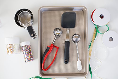 Details: The Oxo Good Grips Cookie Spatula combines the strength of stainless steel with the advantages of silicone. The silicone outer layer, which is heat resistant to 600 Fahrenheit and safe for non-stick cookware, is bonded to a flexible stainless steel core for added stability. The Spatula’s thin, flexible edge glides easily beneath all foods and is the perfect size for getting between cookies on a crowded baking sheet or removing one brownie at a time from the pan. The rounded corner is great for getting sticky cookie dough out of the spoon and the angled handle keeps your hand away from fragile foods and hot dishes. The Cookie Spatula has a soft, comfortable, non-slip grip and is the perfect companion to non-stick cookware and bakeware.