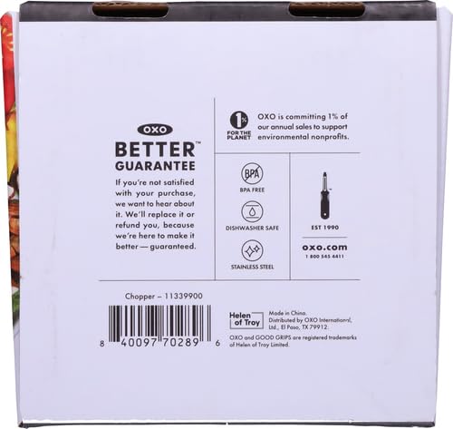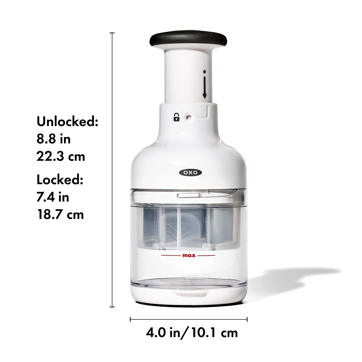 Details: Need to chop up onions, celery, and carrots for a quick mirepoix? How about some tomatoes and cilantro for a salsa? Or nuts for a batch of brownies? The OXO Good Grips Chopper can handle all these tasks much faster than your chef’s knife. (It’s safer, too.) It features a sharp, stainless steel blade that rotates with every single press of the knob, resulting in perfectly even pieces. Load it up and then just press the knob to start chopping. It’s comfortable and easy to use, and the large catcher cup has convenient measurement markings. Of course, the whole thing comes apart for cleanup. Dishwasher safe.