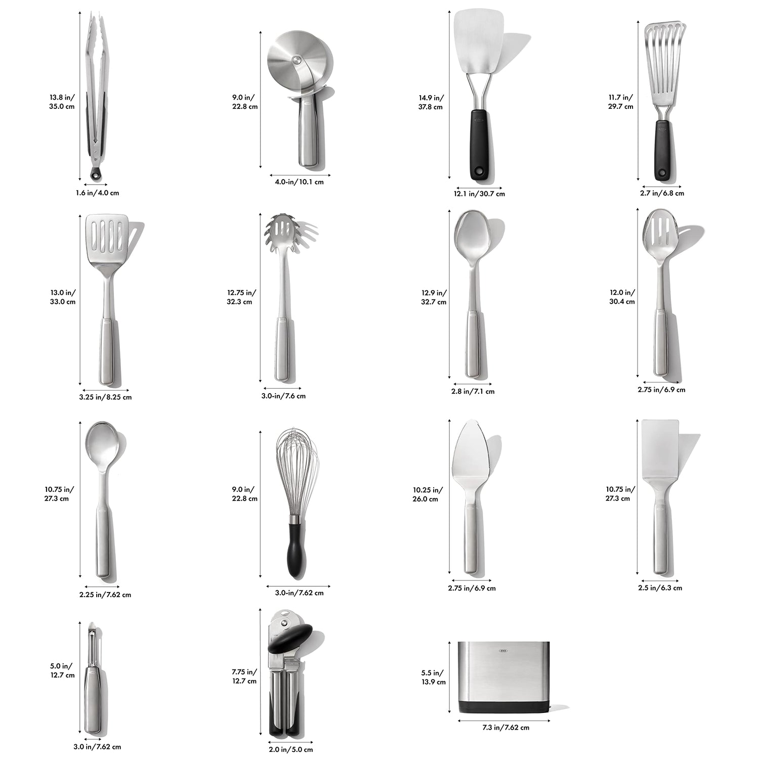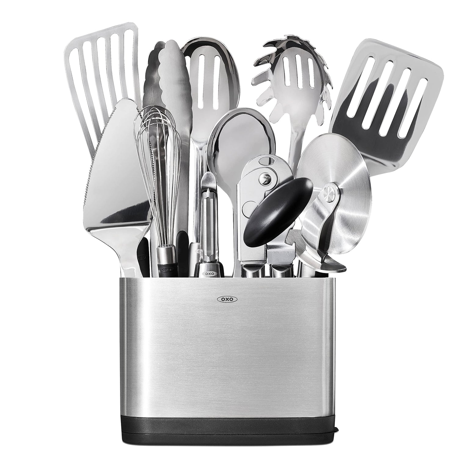 Details: Complete your kitchen with the OXO SteeL 15 Piece Utensil Set. Each stainless steel tool features a sleek design and a comfortable non-slip grip. The Set includes one Spoon, one Slotted Spoon, one Serving Spoon, one Turner, one Lasagna Turner, one Spaghetti Server, one 12-Inch Locking Tongs, one Fish Turner, one Flex Turner, one Whisk, one Pie Server, one Pizza Wheel, one Swivel Peeler, one Can Opener and one Utensil Holder with removable drip tray. Hand-wash only.
