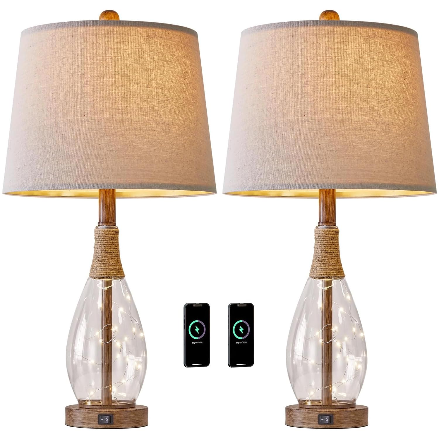 - For Your Loved One: A set of 2 unique glass table lamps, linen fabric lampshades and high-quality resin wood lamp holders add a romantic and warm atmosphere to your living room, rattan wrapped design on the modern table lamp holder and the glass lamp body of the drip-shaped built-in nightlight make the lamp even more unique.