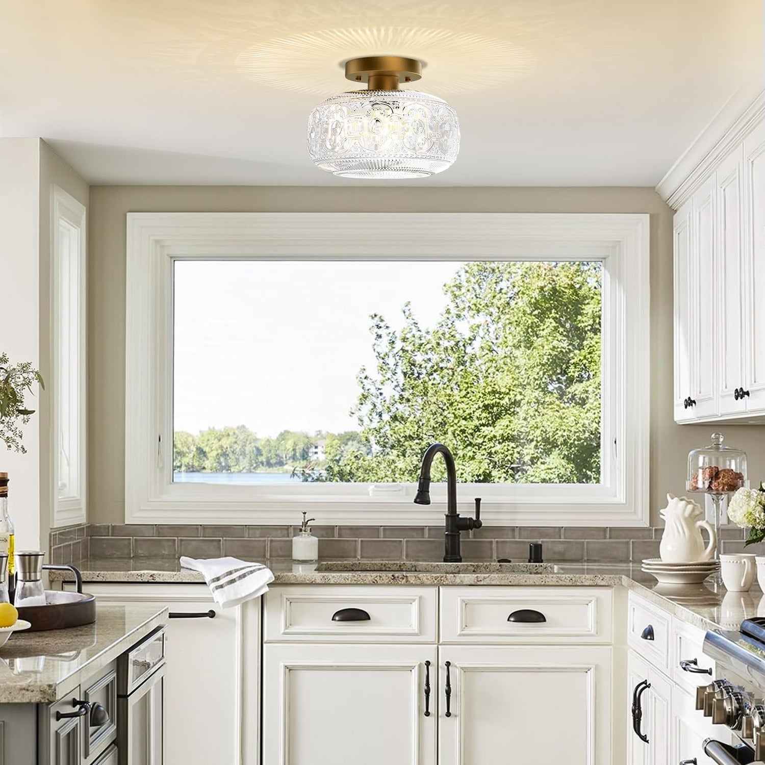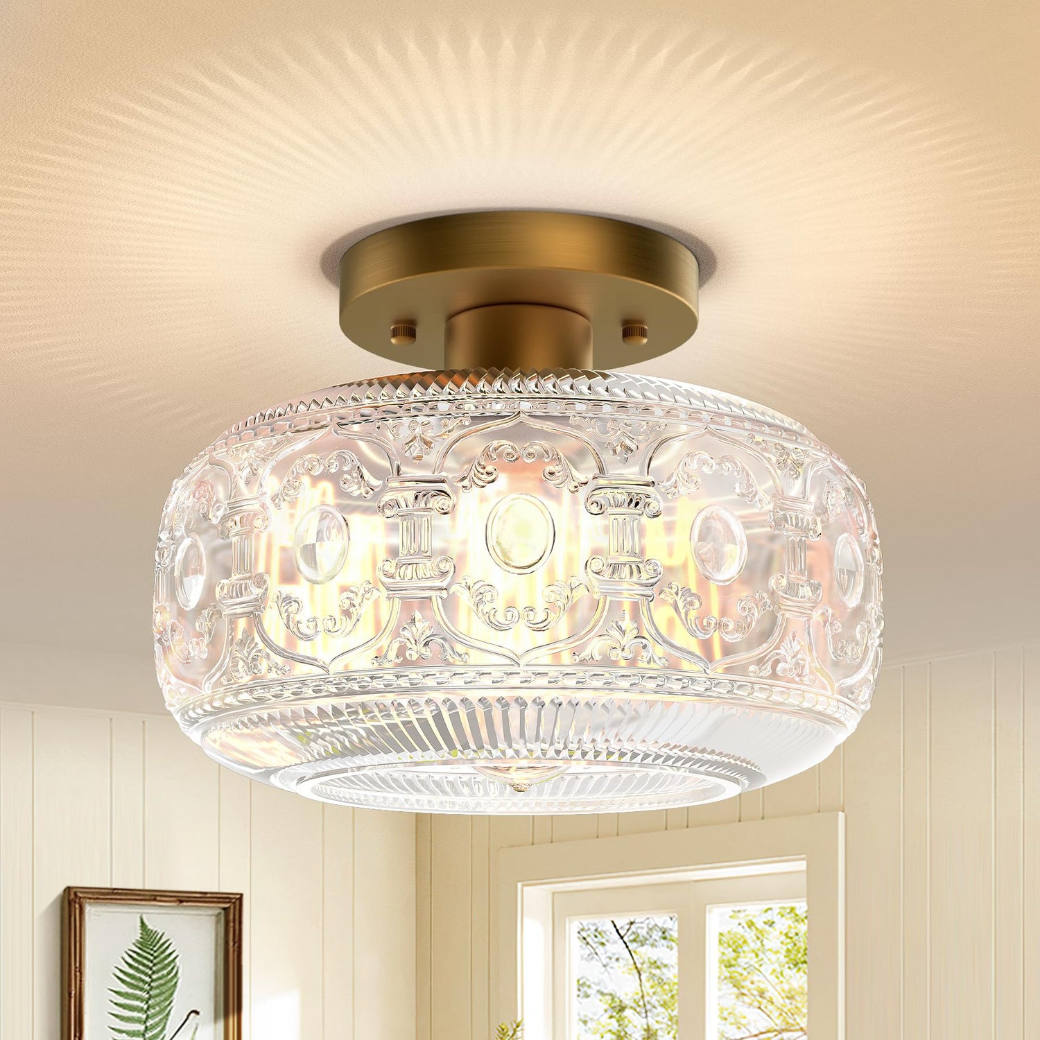 - 【Semi Flush-mount Design】This ceiling light is ideal for vintage farmhouse and industrial aesthetics. Its Matte Golden Base enhances the classic industrial vibe, while the crytal glass adds a touch of rustic charm. The Rome Column figure glass not only casts a beautiful shadow on the ceiling but also creates a romantic atmosphere in your home.