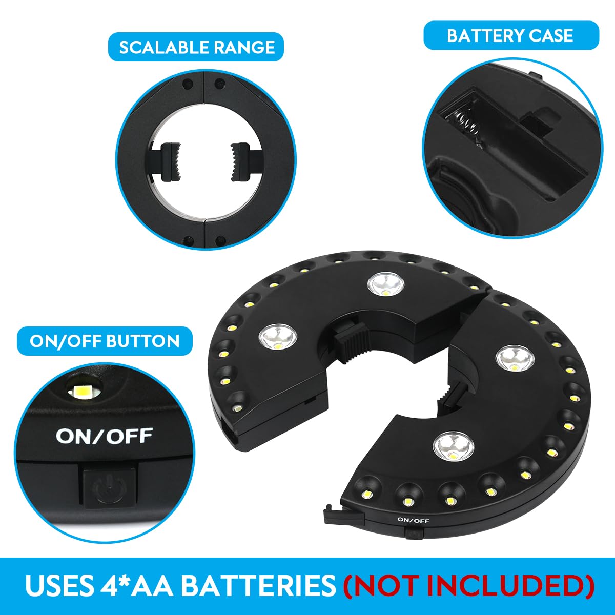 - 1.3 brightness Mode--press once for 4 LED lights(Dim),press twice for 24 LED lights(Bright), or press three times for 28 LED lights(Super Bright).Suit your need for different brightness on different occasions.